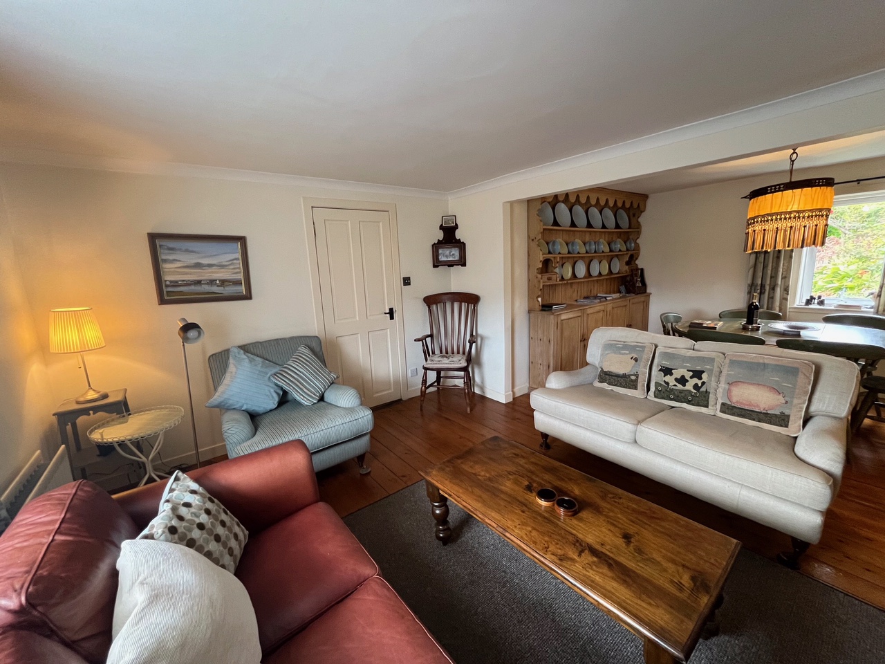 The kitchen is fully equipped with a fridge, freezer, electric oven, hob, microwave and dishwasher, along with every essential utensil, from a corkscrew to a garlic press. A dining table that seats six and a dresser facing the rear garden add to the charm and practicality of this space.