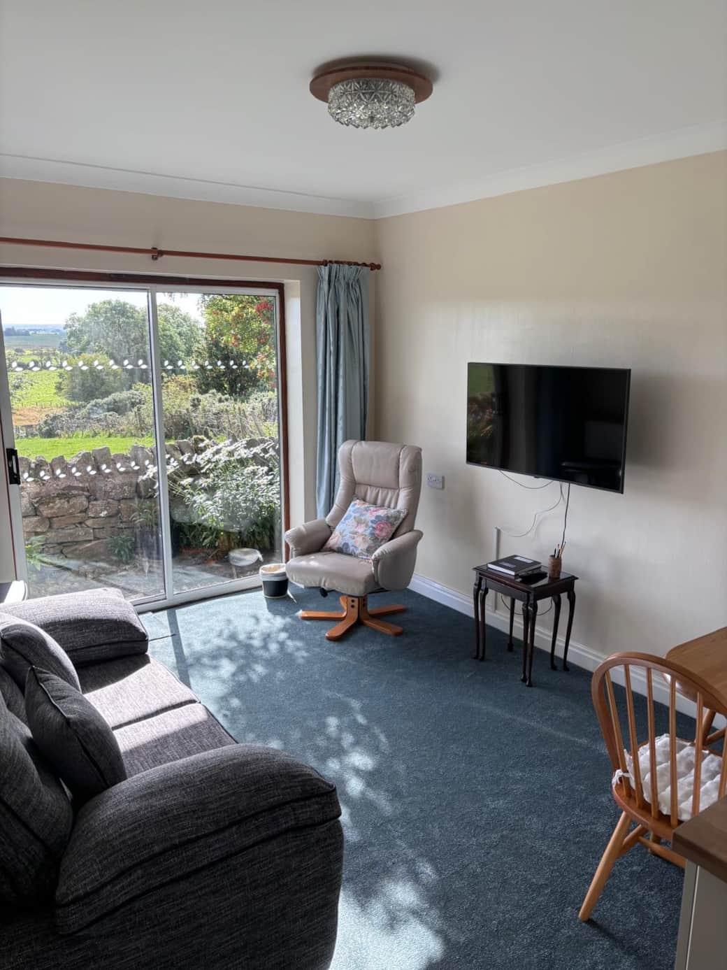 The bedroom includes a double bed, the perfect place to rest your head for a peaceful night’s sleep. The window looks out to breathtaking countryside views. A spacious shower room includes permanent wall-mounted seats and rail for those with limited mobility.