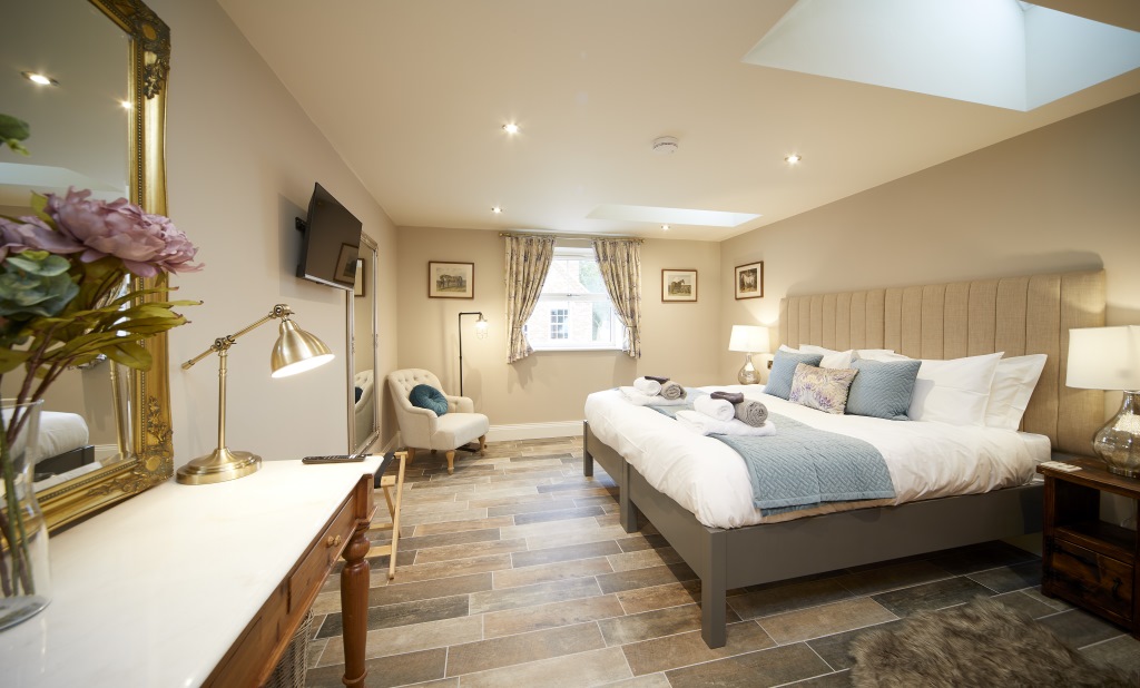 Two bedrooms are available. A ground bedroom comes with a super king and features a freestanding bath in the spacious en suite as well as a separate shower. The second ground-floor bedroom has a super king that can be turned into a twin and features an en suite shower.