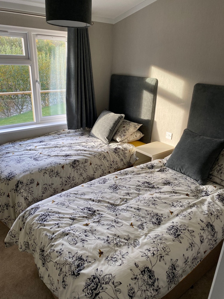There are two luxury bedrooms, including a master bedroom with an en-suite bathroom, a walk-in wardrobe and patio doors leading to the decking. The second bedroom features twin beds and there is also a spacious family bathroom with a bath. The lodge comfortably accommodates up to four people.
