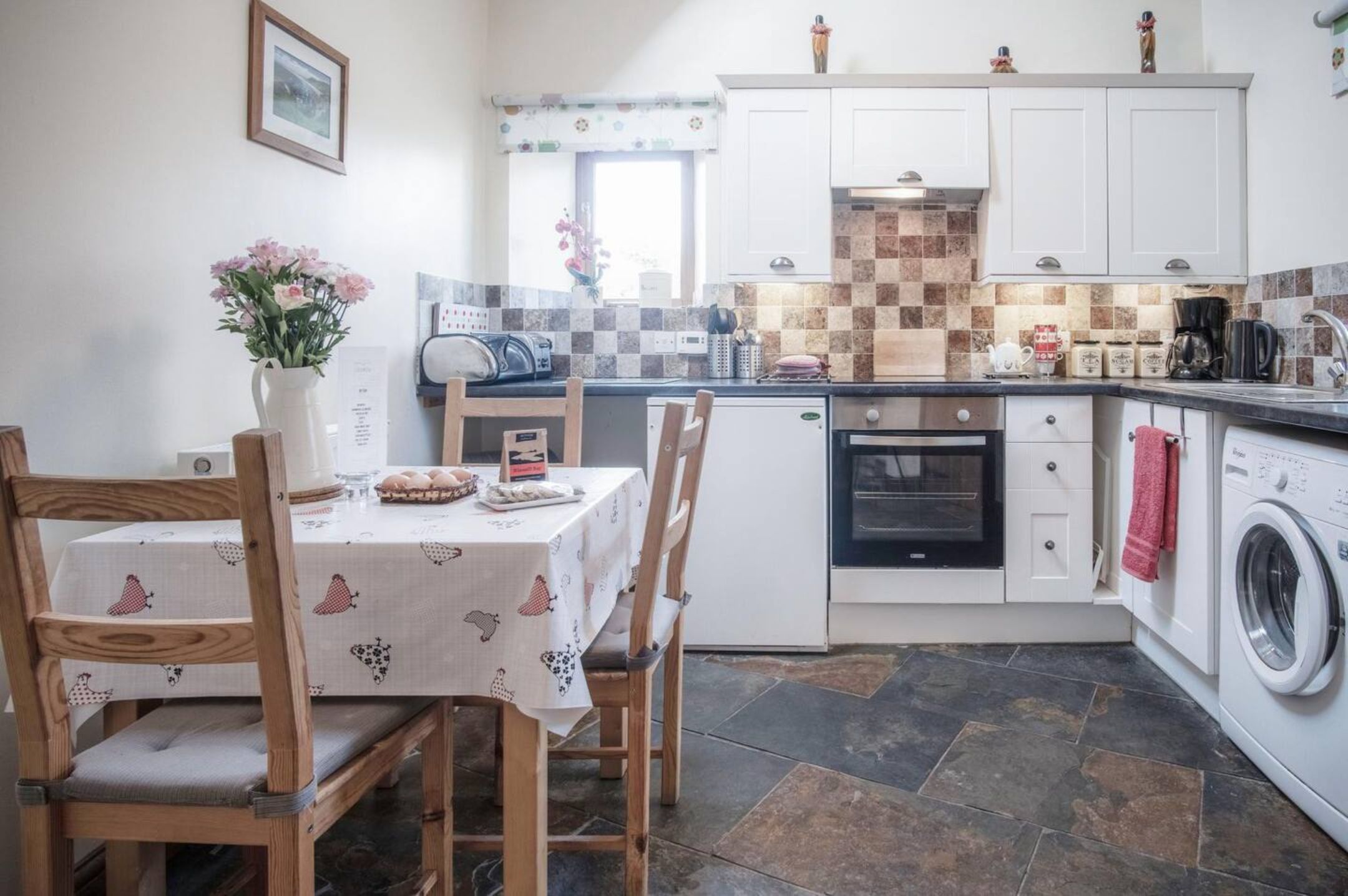 This is a beautifully converted former local inn, offering spacious and comfortable accommodation for up to five guests, with the option of a sixth using a fold-away bed. The cottage features two bedrooms, one double and one triple with bunk beds and a single, making it ideal for families or small groups. Inside, you’ll find an open-plan kitchen, dining area and lounge, along with a generously sized bathroom. The fully fitted kitchen includes a washing machine, dishwasher, fridge-freezer, microwave, electric fan oven, kettle, toaster and coffee machine, with a wooden dining table and chairs set on natural stone flooring. The lounge is comfortably furnished with two settees, occasional furniture, a TV, DVD player, exposed beams and an electric log-effect fire, all warmed by oil-fired central heating. Each bedroom includes built-in wardrobes and drawers, with all bed linen provided. The bathroom offers a bath, separate shower cubicle, basin, toilet and an electric shaver point, with towels supplied for use in the cottage. Outside, a private patio area with table and chairs provides the perfect spot for al fresco dining.