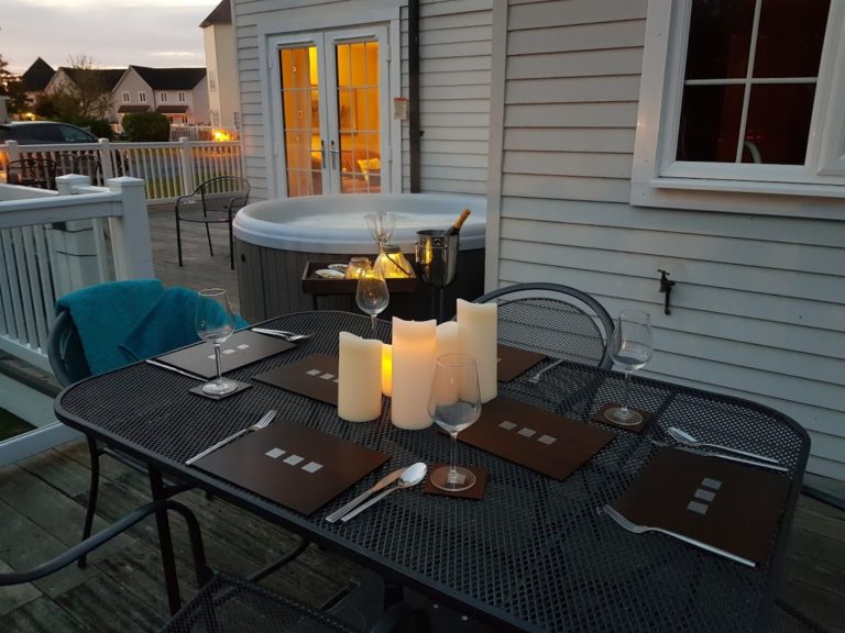 French doors lead to an enclosed decking area with a hot tub, BBQ, table and seating for six, all with stunning lake views. Large outdoor bean bags are provided for lounging by the water.