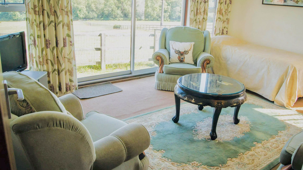 Sitting room (single bed) & patio doors.