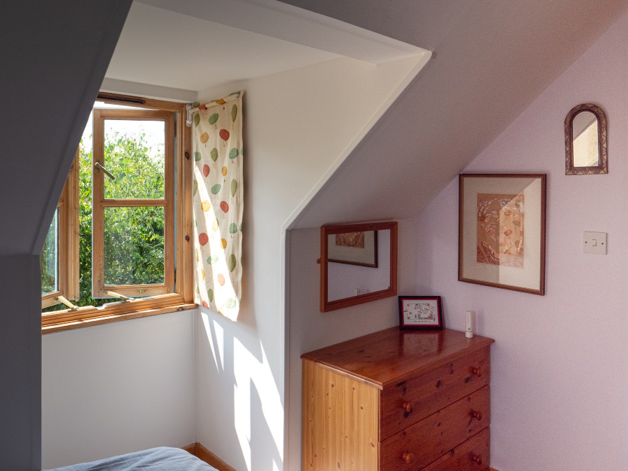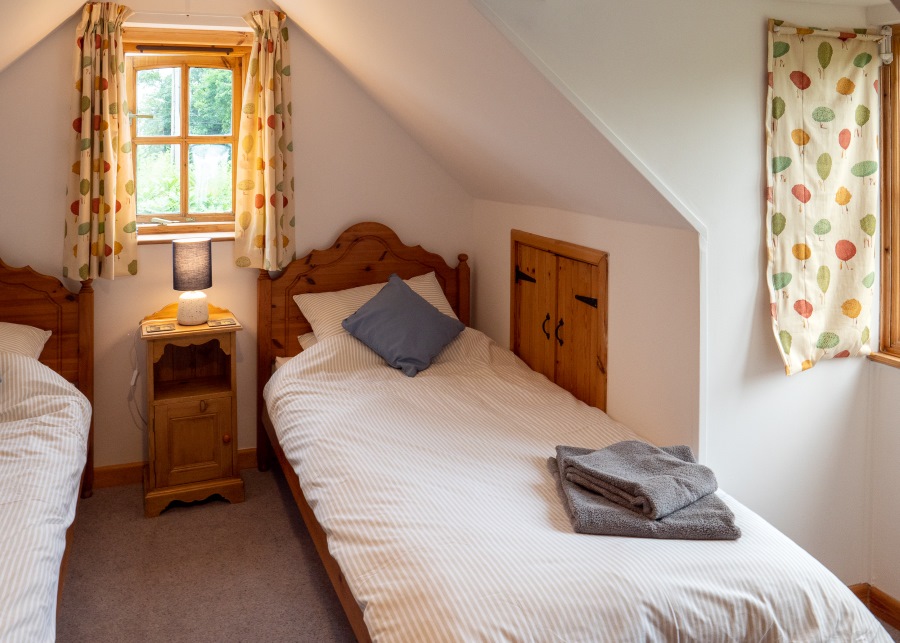 Upstairs, the bedrooms are in the cottage style with sloping ceilings; One has twin beds and the other a double bed. They are equipped with a duvet and two pillows per person. A wardrobe is provided on the landing and each room has ample drawer space.
