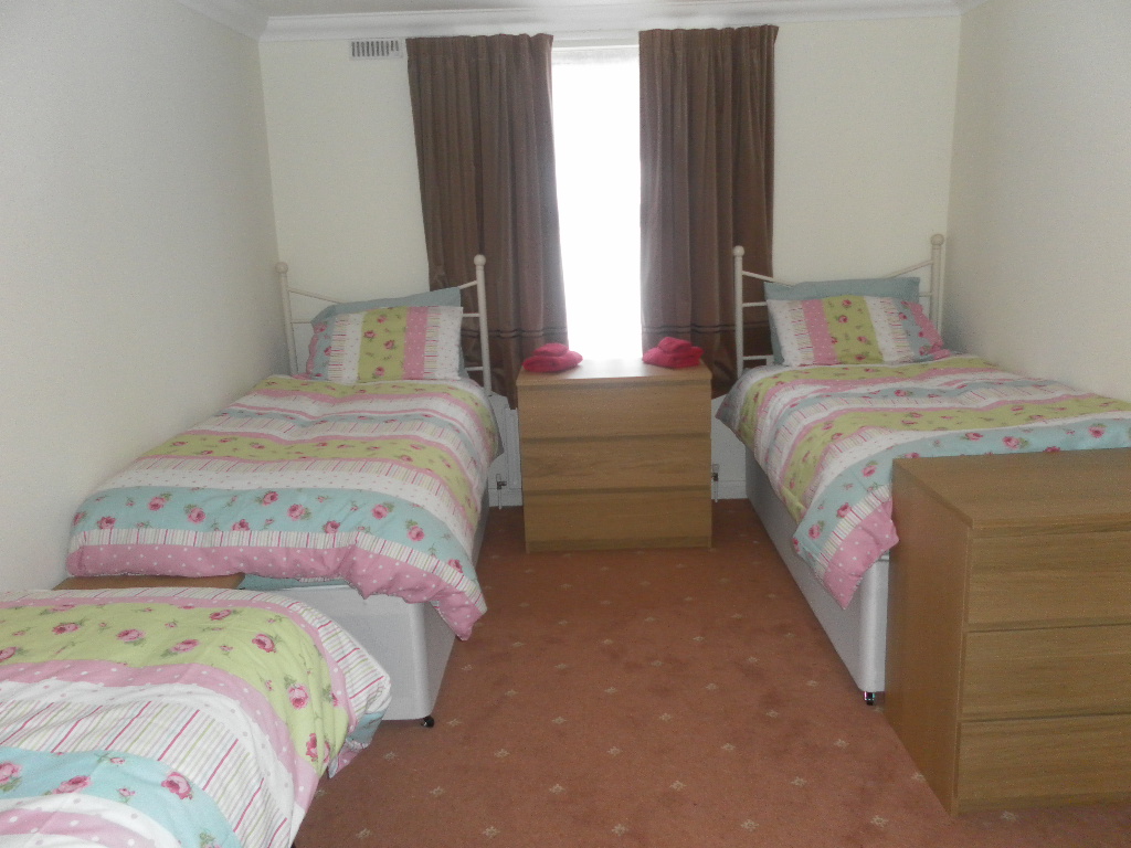 The master bedroom features an en-suite bathroom with a separate shower, washbasin, and WC. The second bedroom is designed for flexibility, furnished with two single beds that can be configured as either a twin or a double, depending on guests’ preferences.