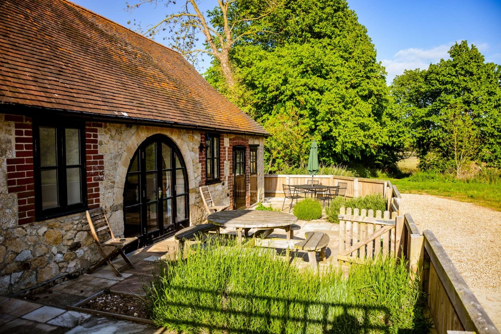 This is a converted one storey farm building, originally a dairy and then a farm shop and was converted to holiday accommodation in 2016. It has been converted to spacious accommodation for 4 people and is wheelchair/disabled friendly. It maintains the stone flooring throughout that is a reminder of its previous use. It has a large king size bedroom with well-appointed en suite shower room. The smaller second double bedroom is also en suite. There is a large open plan sitting room/kitchen that opens onto a large patio and enclosed garden that looks out over fields towards Freshwater Church and is 5 minutes’ walk along a footpath to the Red Lion Pub.