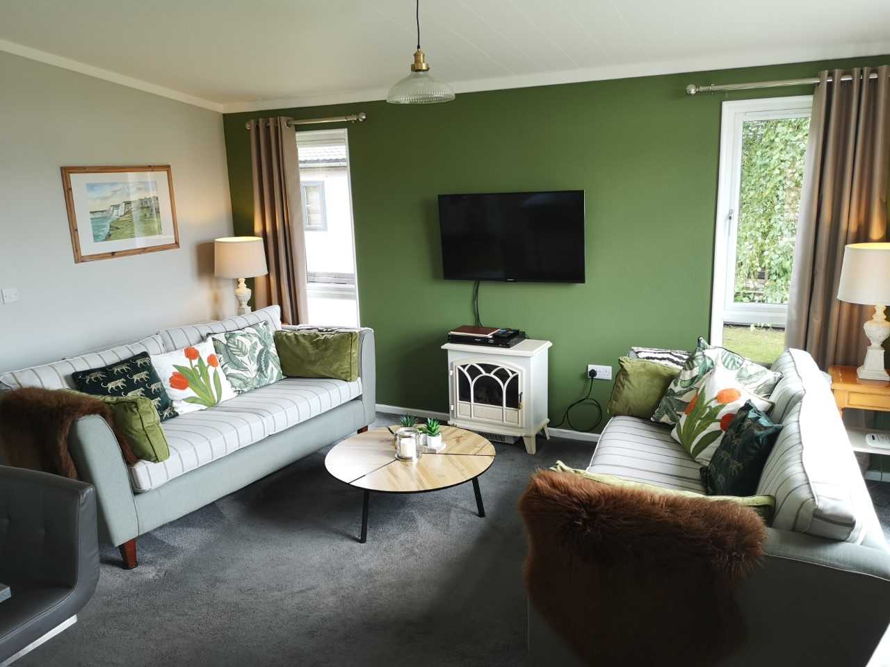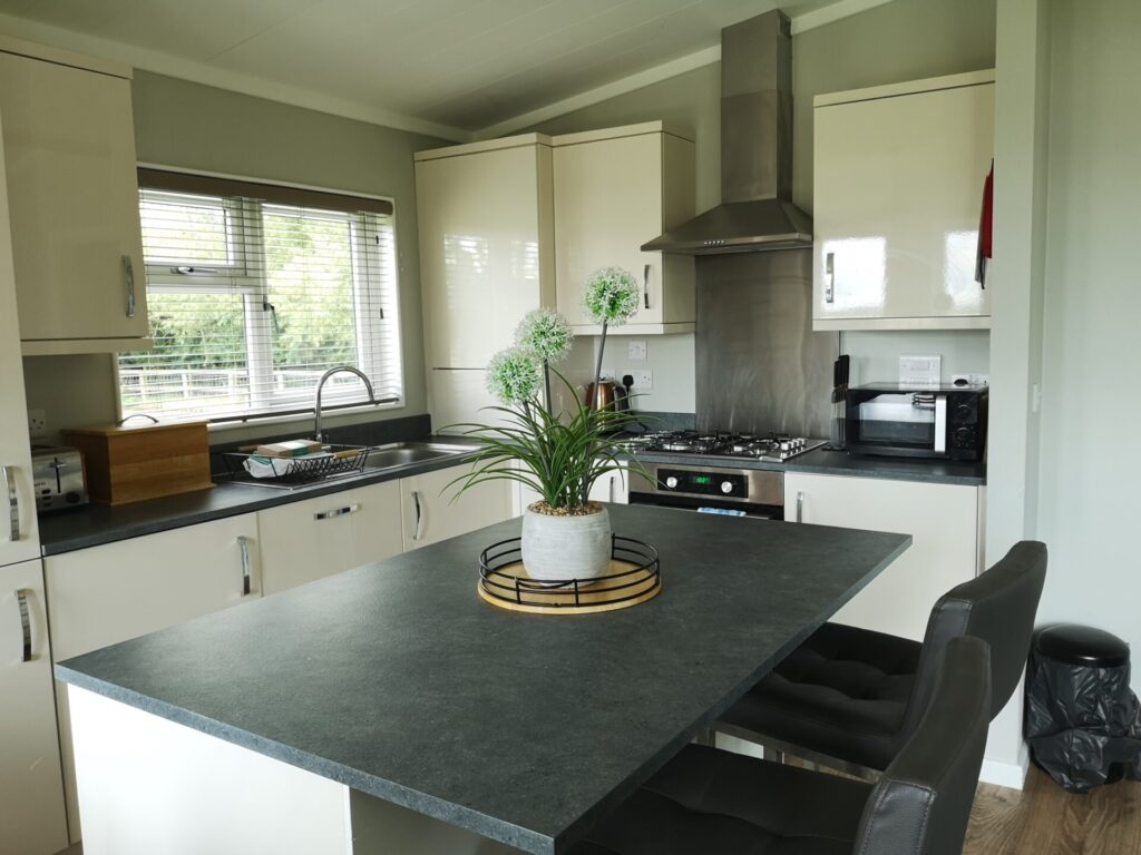 Sleeps 6. Brand new lodge with 3 bedrooms: a main en suite and two twin rooms. The fully-equipped kitchen includes a washing machine, dishwasher, fridge/freezer, gas hob, electric oven and microwave. A spacious open plan living/dining/kitchen area is perfect for relaxing in.