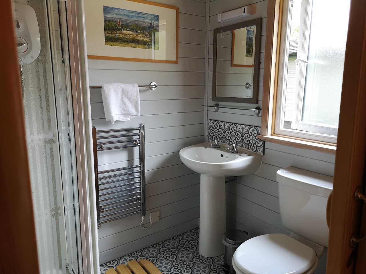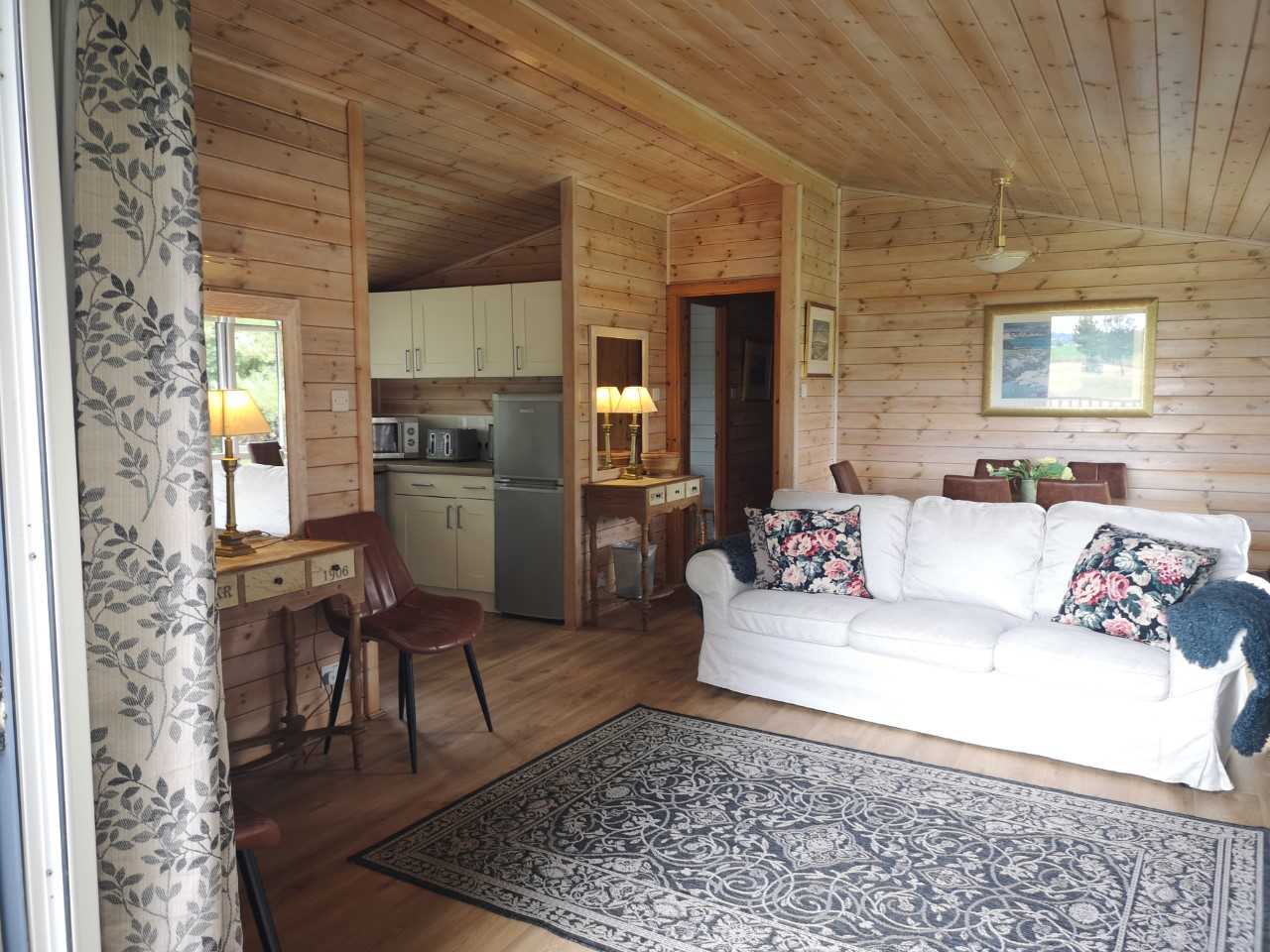 Sleeps 6. It has two bathrooms, the master bedroom having an en-suite shower room. The lodge is ideal for walkers in any season as it has an entrance lobby with a cupboard for outdoor clothing. Fully equipped kitchen, full-sized dishwasher, fridge freezer, washing machine, TV & DVD, light and beautifully furnished living area, outside there is a generous decked veranda with table and chairs.