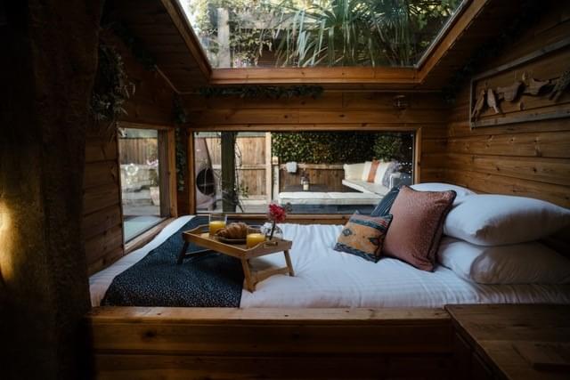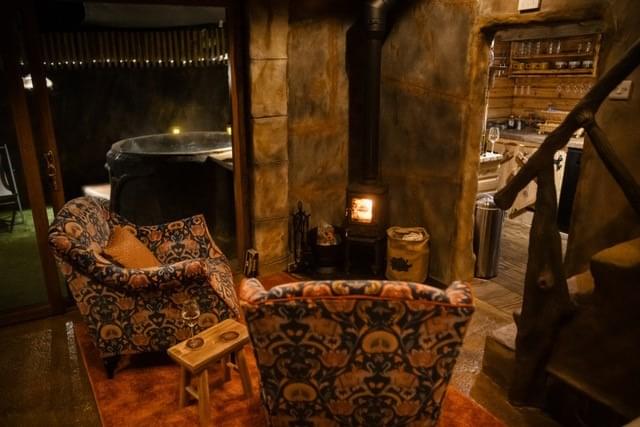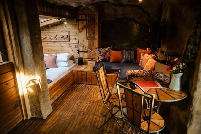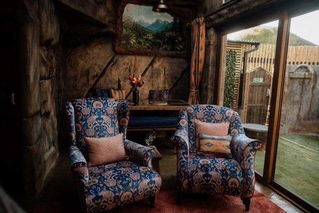 The Cave, sleeping up to five adults, welcomes you with a peaceful garden haven where a gentle water feature, crackling fire pit and cosy seating area set the tone for relaxation from the very first moment. As you draw near, an impressive stone wall reminiscent of a Jurassic landscape stands tall, its weathered surface hinting at the secrets waiting just beyond. Step through the wooden gate and discover a hidden sanctuary designed to captivate and delight.