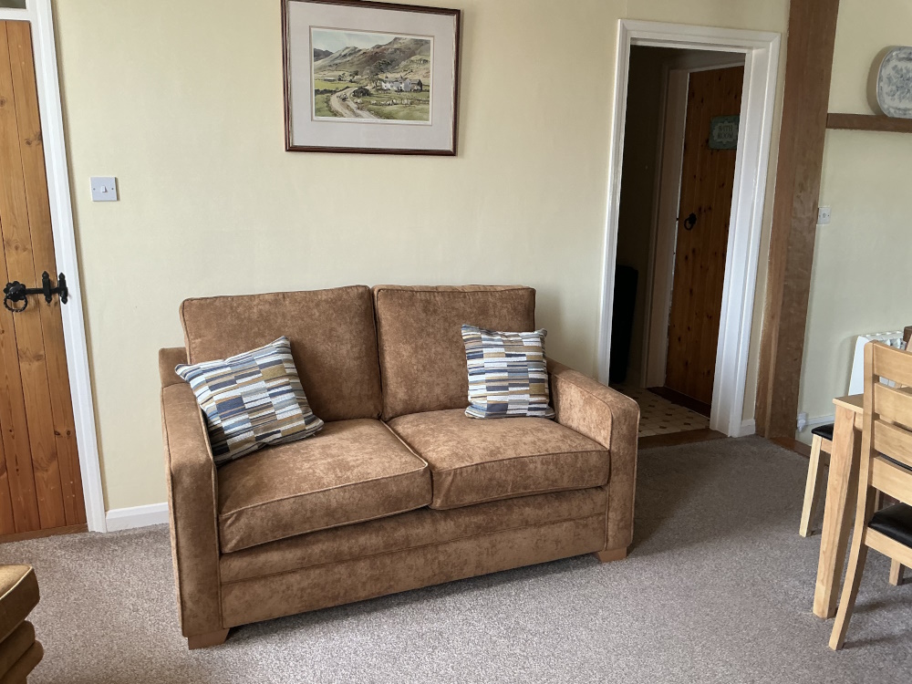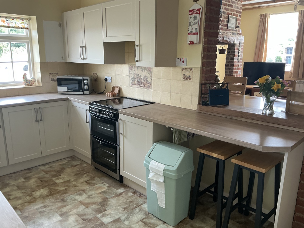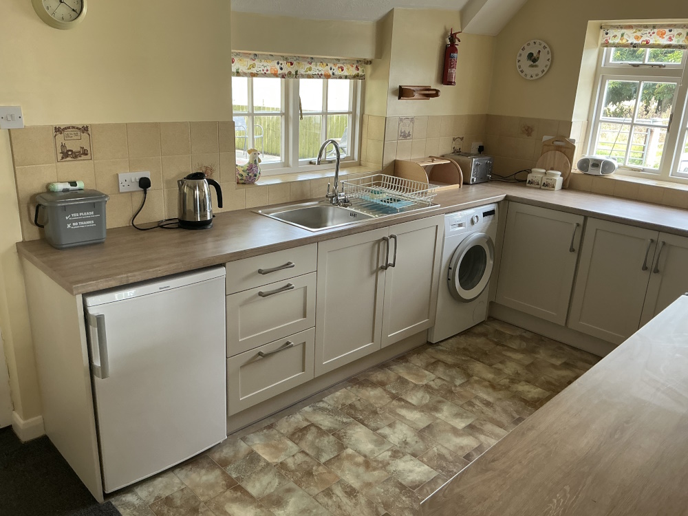 The fully equipped kitchen includes an electric cooker, microwave, washing machine, fridge and freezer, making it easy to prepare meals during your stay. The adjoining lounge/dining room provides comfortable seating for up to five people, perfect for relaxing or enjoying meals together. A spacious bathroom features a bath with an overhead shower. All bed linen, bathroom and kitchen towels, electricity, and heating are included in the price. Outside, guests can enjoy a large lawn and paved patio area, complete with garden furniture, perfect for soaking up the countryside atmosphere.