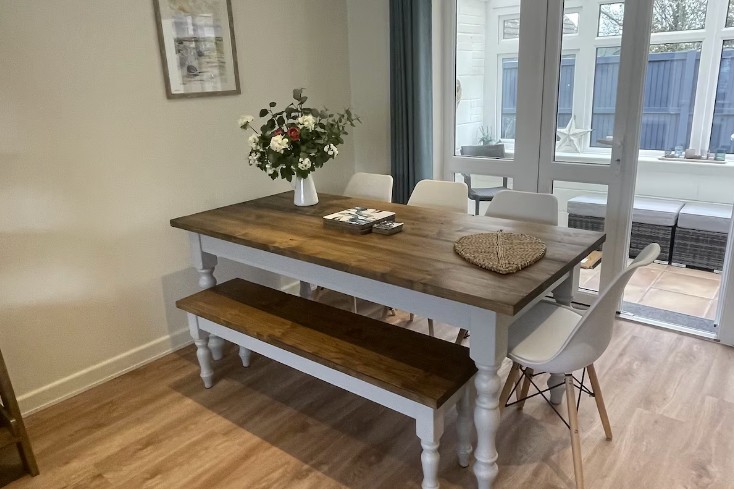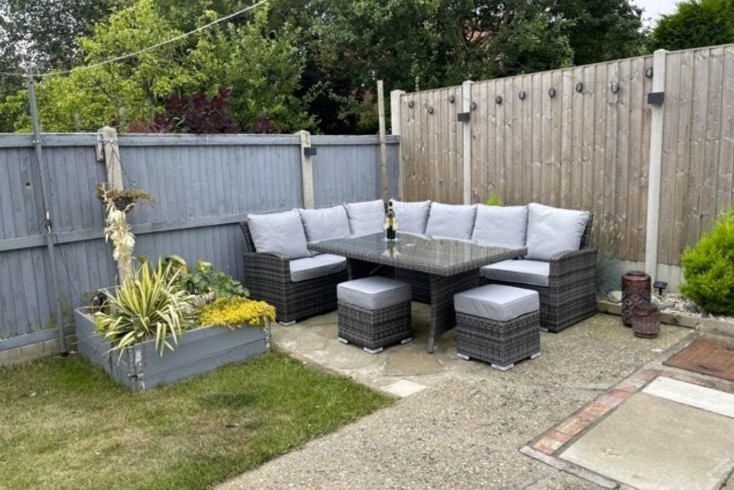 The house features a private driveway with parking for up to three cars and a fully enclosed, sunny rear garden complete with a six-seater table and a corner sofa with comfortable cushions — perfect for relaxing outdoors. A ground floor bedroom and bathroom make it convenient for guests of all ages.