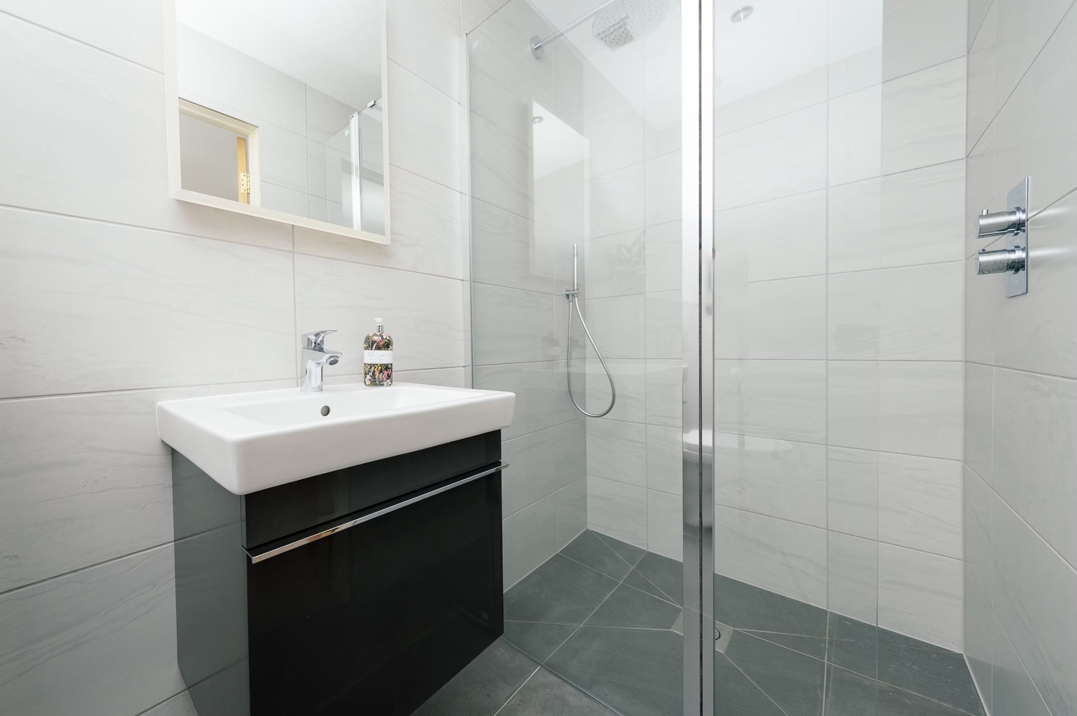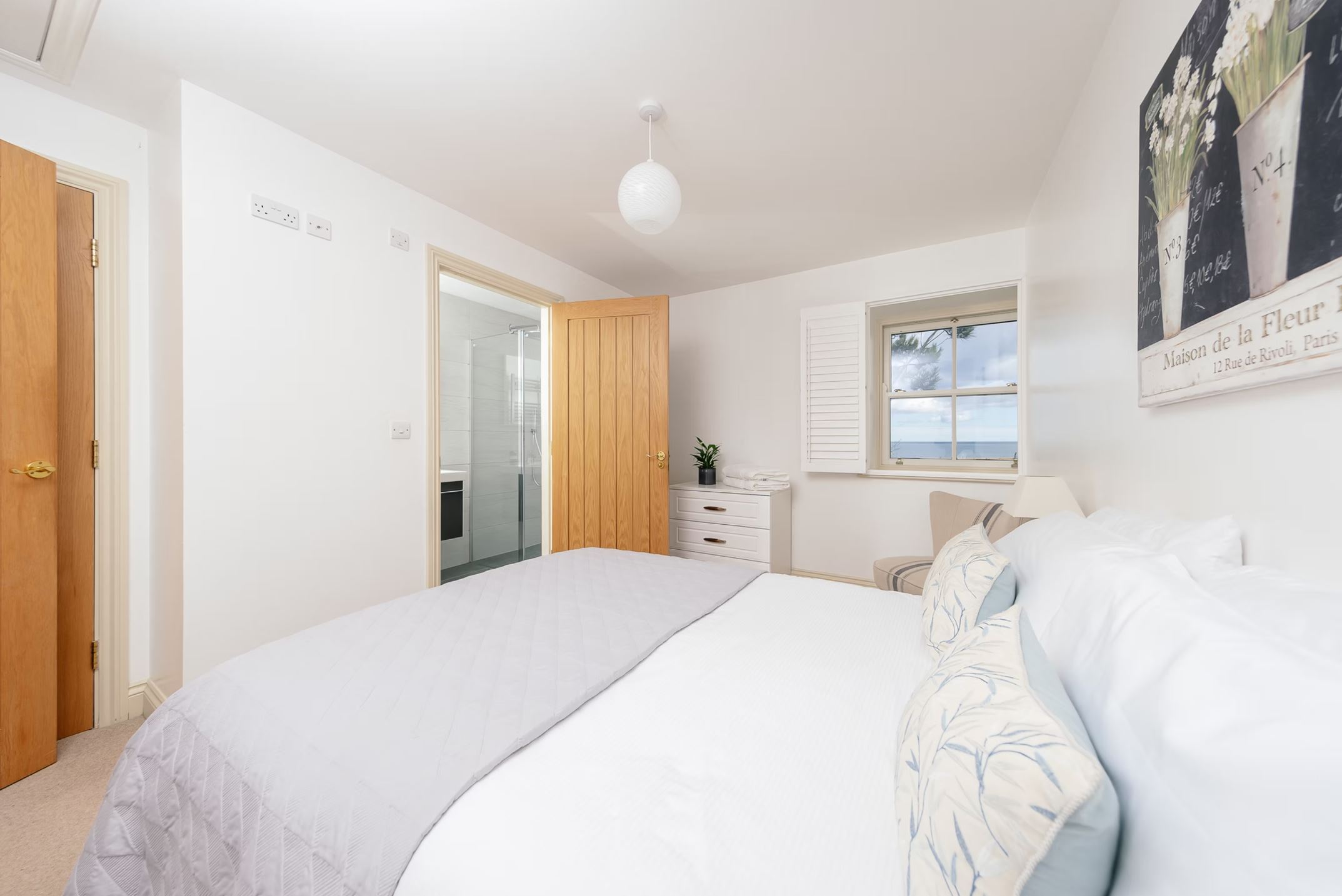 There are two luxury bedrooms. The ground floor bedroom has an ensuite bathroom, panoramic sea views and a very comfortable king-size bed. The first-floor bedroom provides twin beds and a built-in wardrobe, with an adjacent bathroom that includes a bath, wash basin and toilet.