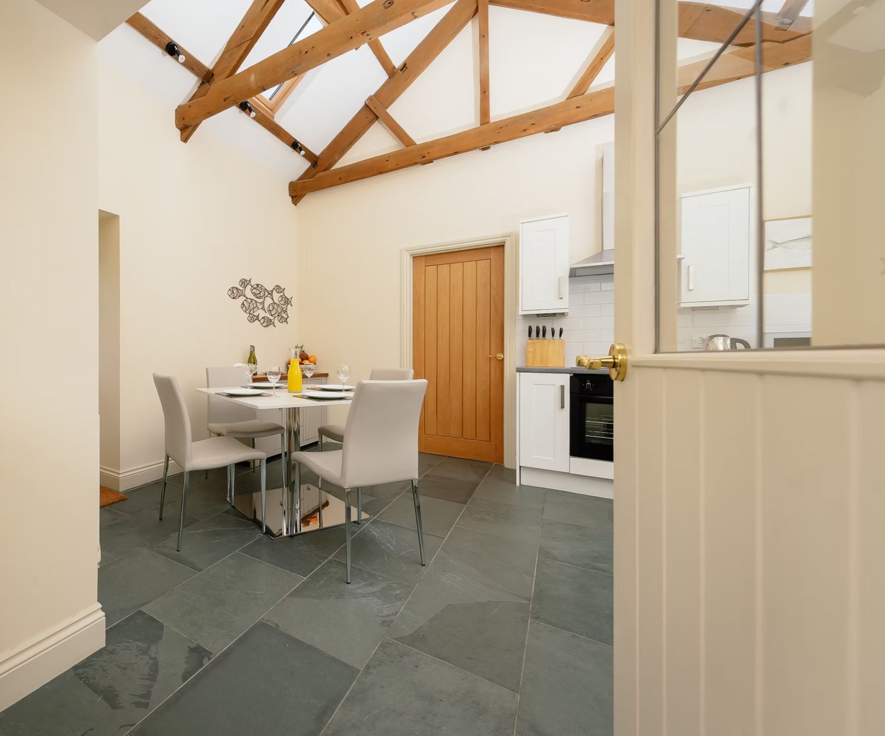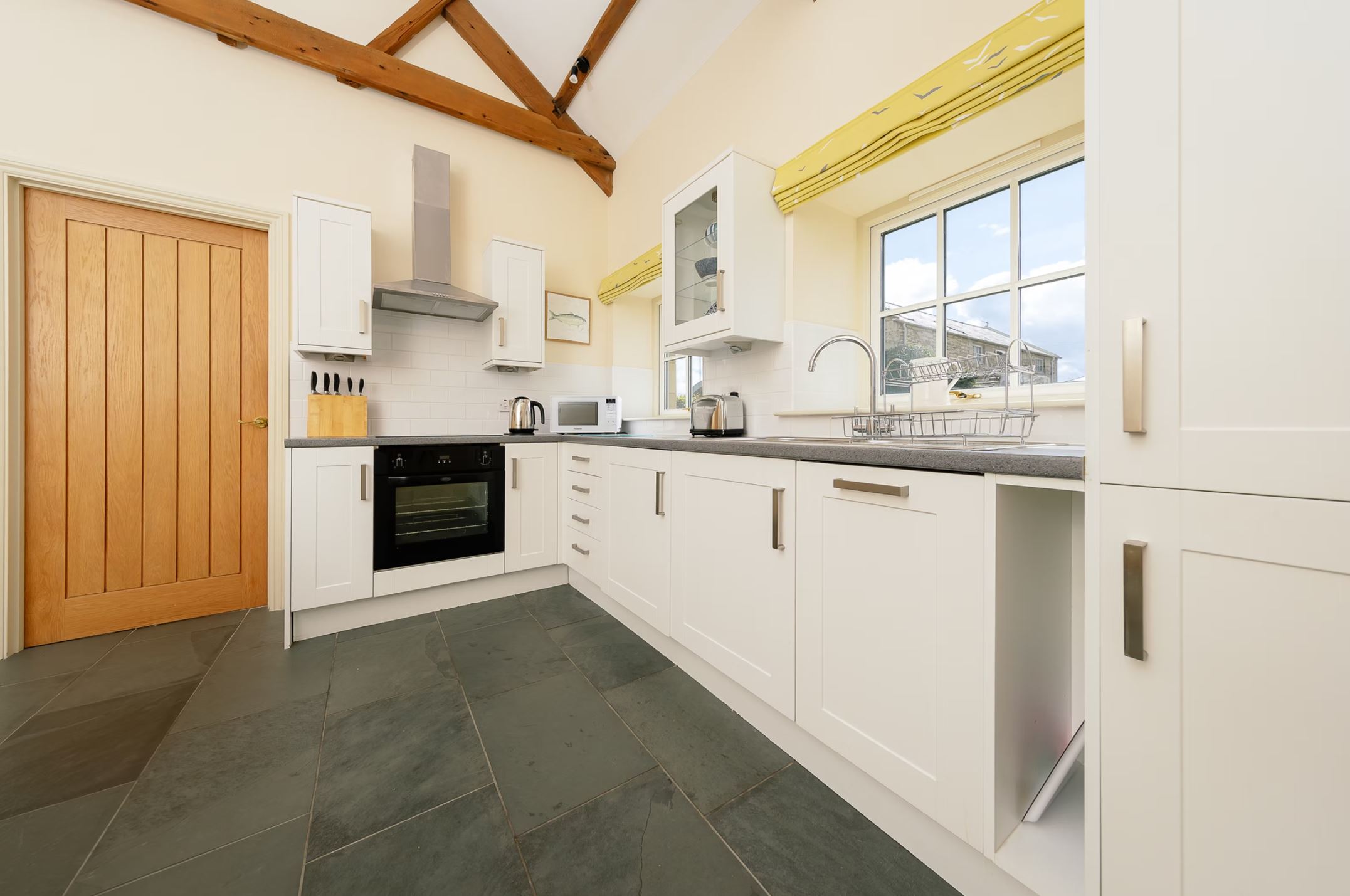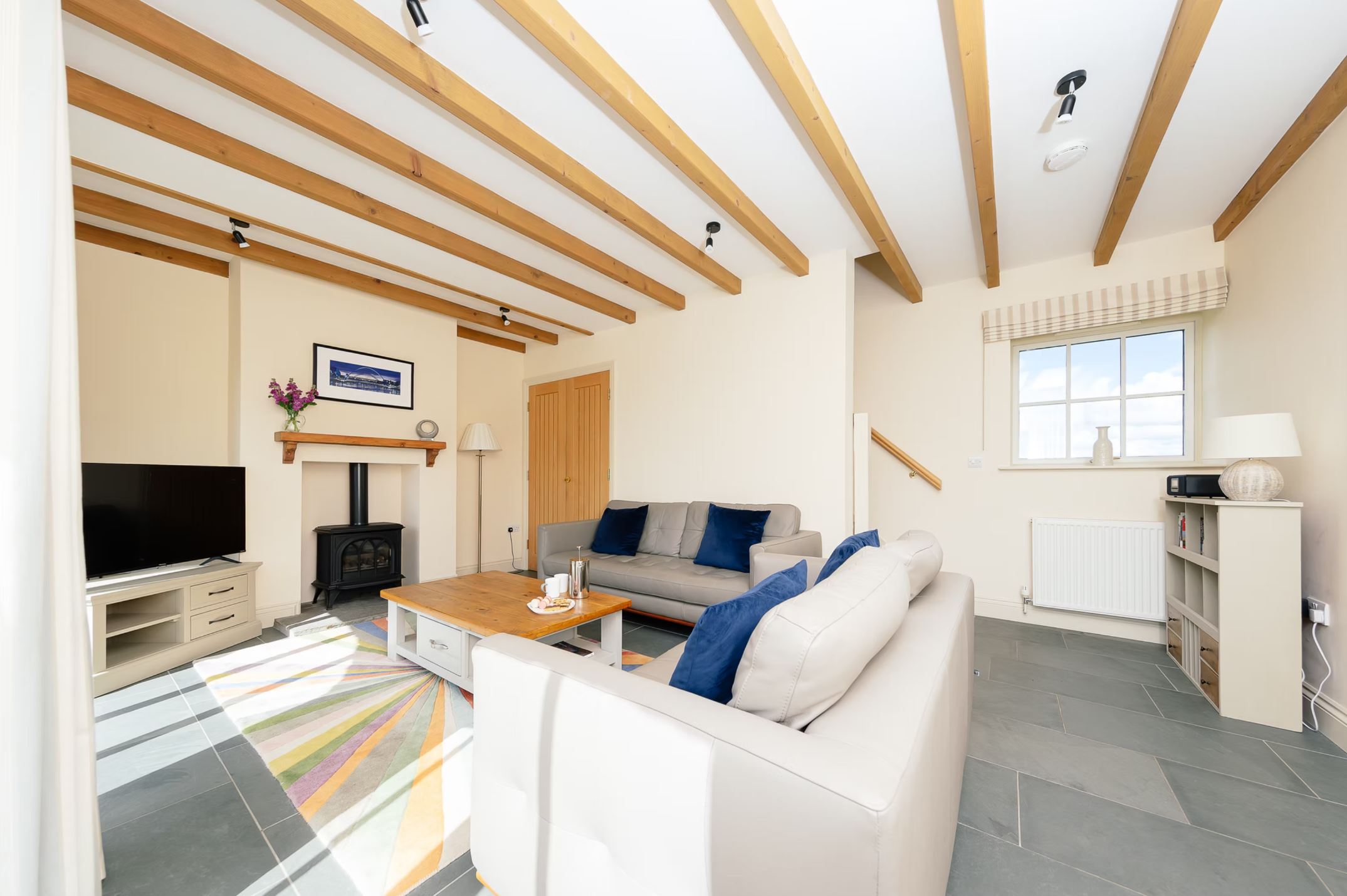 The cottage features two hemmel arched windows that fill the immaculately furnished lounge with light. A gas coal-effect fire creates a cosy atmosphere during winter evenings and the lounge also includes a large Smart TV and free WiFi throughout. The spacious dining kitchen is well equipped with an electric oven and hob, fridge freezer, dishwasher, washing machine and microwave and is enhanced by a vaulted ceiling with exposed beams.