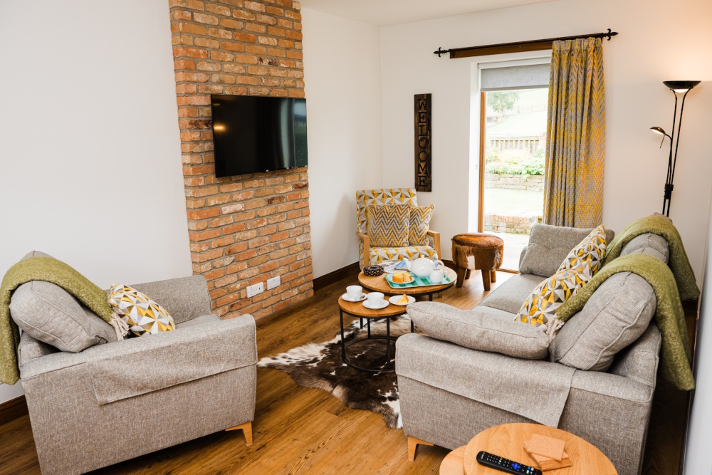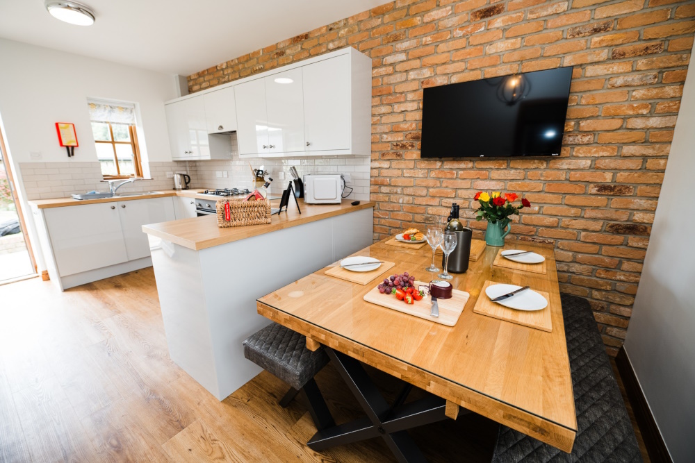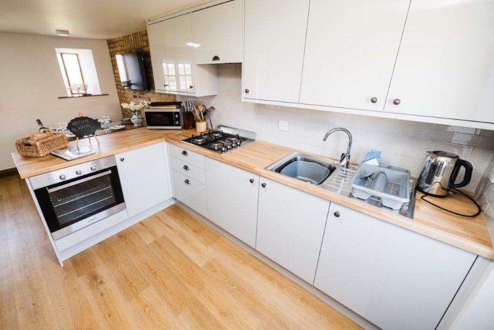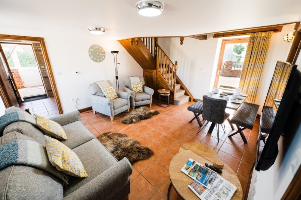 This single-storey, two-bedroom modern barn conversion offers spacious, thoughtfully designed accommodation with an emphasis on quality throughout, comfortably sleeping four guests. The bright and sunny lounge features quality furnishings, a 45” Smart TV and a large picture window with open views to the rear. The modern kitchen and dining area is well-equipped for a self-catering stay and also includes a 45” Smart TV, with a door leading out to a pretty, sunny and private rear garden. The cottage opens into a spacious hallway with coat hooks, which leads to a contemporary shower room with a large walk-in shower, WC, basin, storage and shaver point. The large double bedroom offers built-in wardrobes, a 32” Smart TV, ample space for a travel cot and views across the fields, while the smaller twin room also features a 32” Smart TV, built-in wardrobe and views.