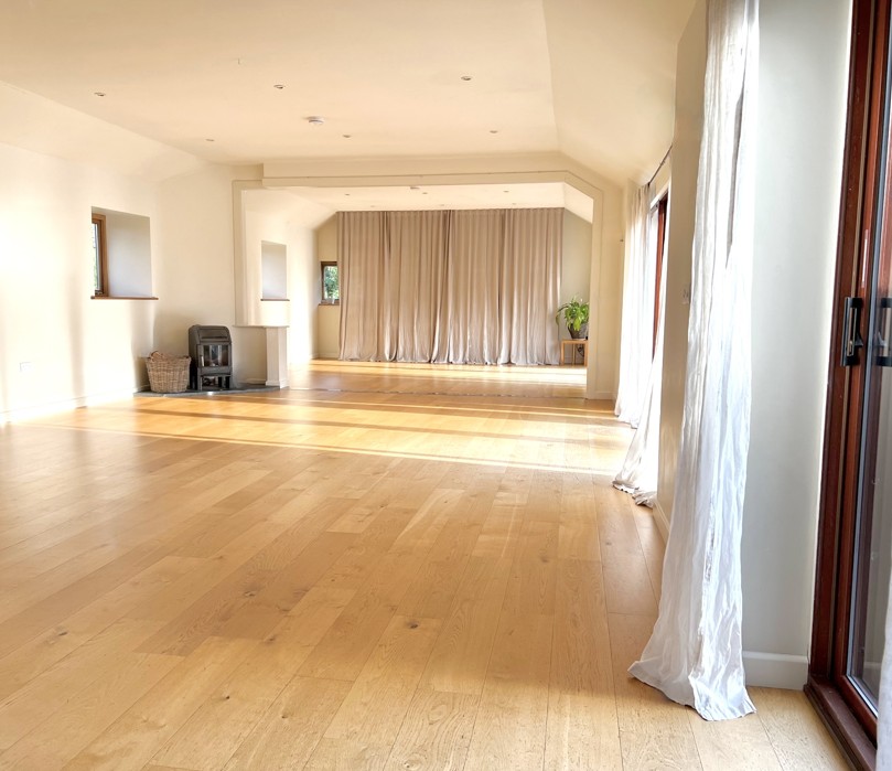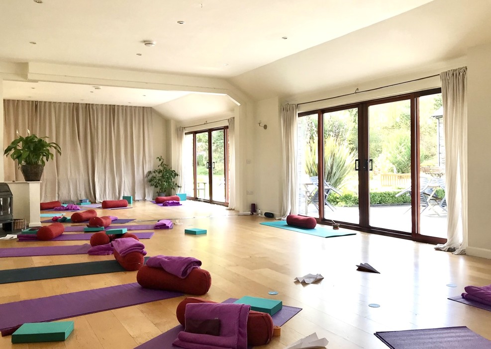 Catering is flexible: each building has a fully equipped kitchen but most retreat leaders opt to hire one of Garth’s recommended chefs for plant-based or Ayurvedic menus adapted to individual dietary needs. Dining can be arranged family-style for up to eighty guests in Hafod’s “big space”, which also transforms into a candle-lit practice room for restorative or yin sessions after dark.