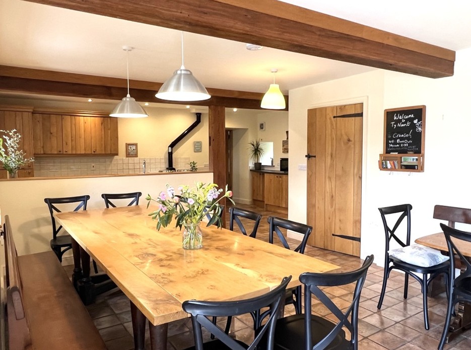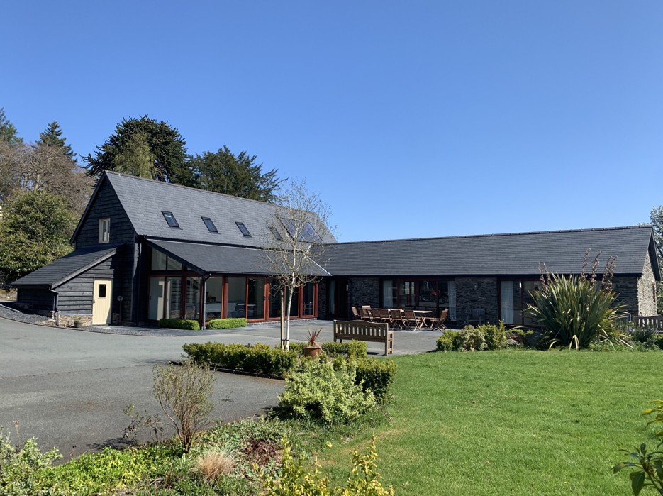 Accommodation is spread across three stylish conversions. Hafod Barn and Ty Nant flank a landscaped courtyard with pond and stream, and Garth Country House adds period charm; together they offer 18 bedrooms (16 en-suite) and can sleep anything from a cosy group of eight up to 50 guests, making the venue ideal for yoga and wellness breaks, teacher trainings, corporate wellbeing breaks or large themed retreats. Fibre-optic Wi-Fi, wood-burners with logs supplied, and spacious kitchens ensure modern comfort alongside rustic character.