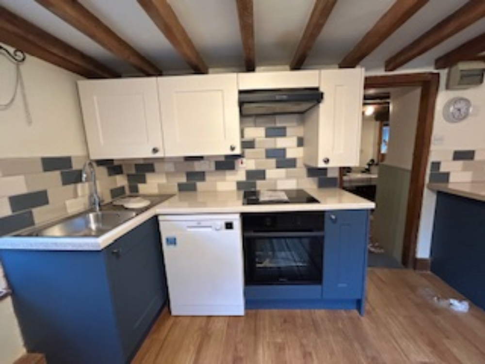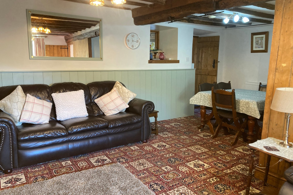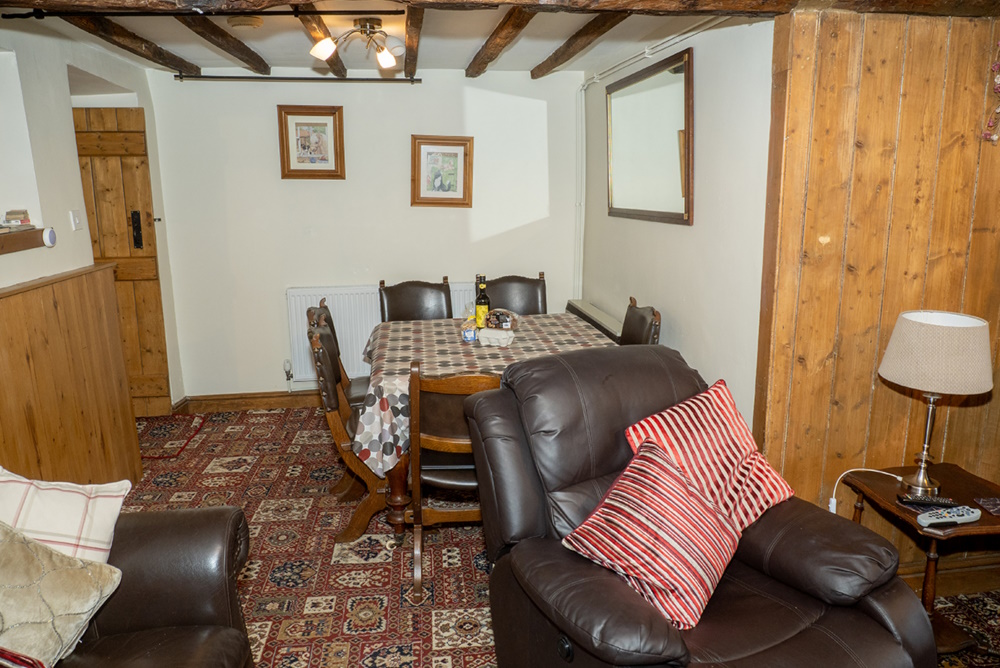 The entrance to the farmhouse opens into a small hallway with a staircase. To the left is the main lounge and dining area, while to the right is a second lounge, ideal as a children’s playroom. The main lounge is L-shaped, featuring a dining table that seats up to six people. Full of original character, the room boasts a large open stone fireplace with a multi-fuel stove, flanked by the original bread oven and salting hole. The space is furnished with two easy chairs and a leather suite and includes a TV, DVD, and VHS player for family entertainment.