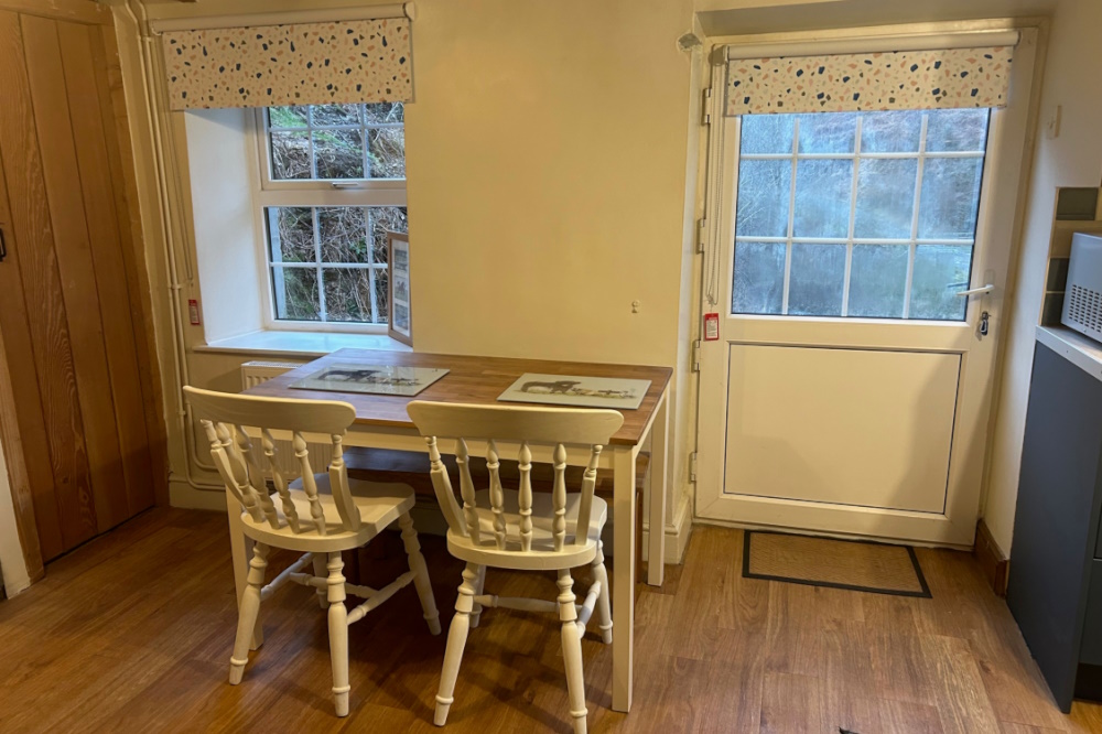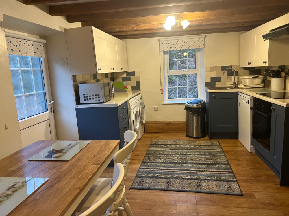 The dining area leads through to a spacious, well-equipped kitchen with everything needed for a comfortable stay. It includes a washing machine, tumble dryer, Rayburn, electric hob and oven, toaster and kettle. A second table and chairs provide additional dining space and a back door opens onto a patio with outdoor furniture, perfect for enjoying the peaceful surroundings. The second lounge, located to the right of the property, is a cosy space for children with a sofa, armchair, gas fireplace, TV, VHS and DVD player.