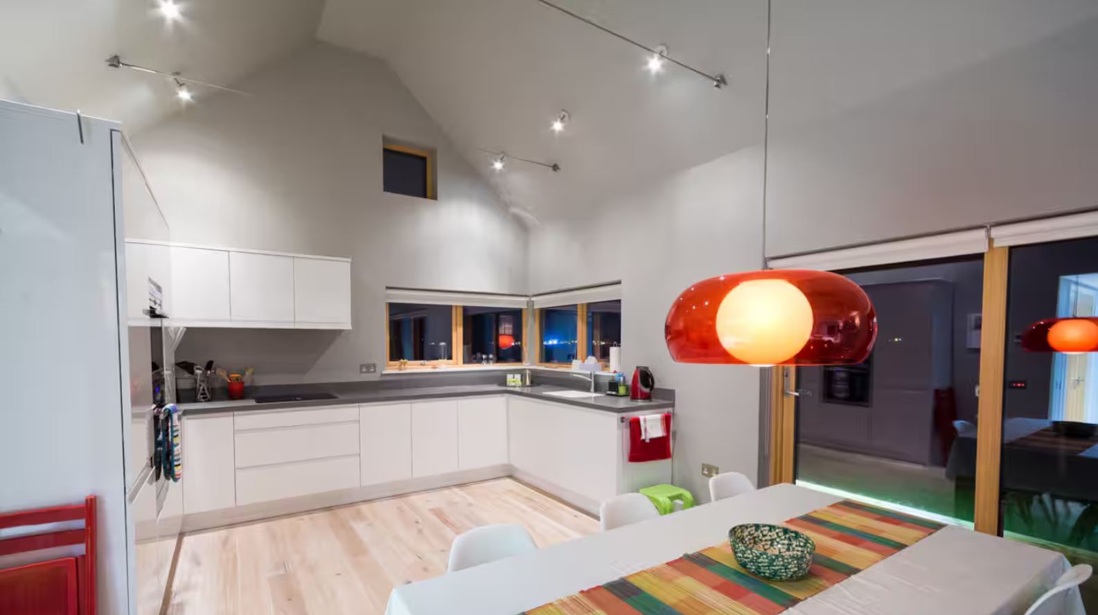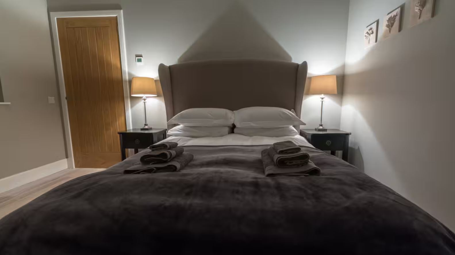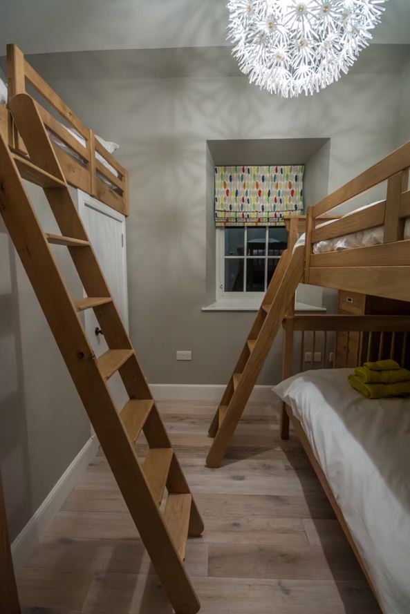 The old chapel section houses three inviting bedrooms that sleep up to seven guests. The master bedroom features a king-size bed, ample storage and an ensuite shower room with beautiful views. Bedroom one includes a double bed and generous storage, while bedroom two is ideal for families, offering a double bunk bed and an additional elevated single bunk with a removable ladder. The main bathroom includes a full-size bath with a mains shower and glazed screen. All bed linen and towels are 100% cotton and locally made Shetland Soap Company toiletries are provided for an extra touch of comfort.