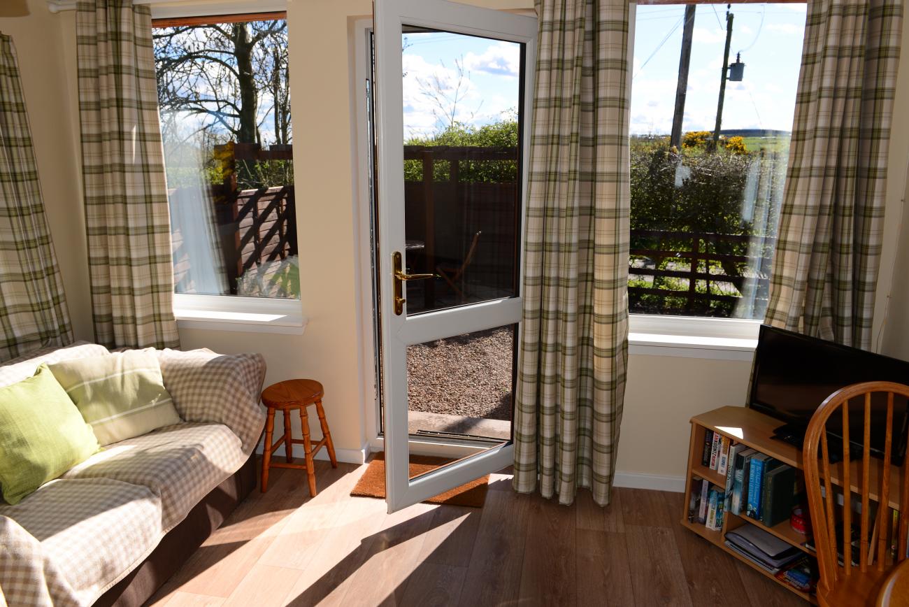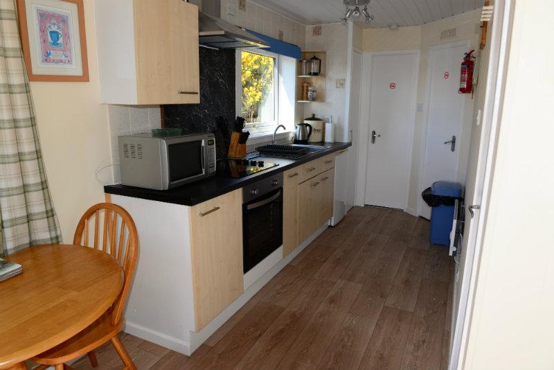 This spacious chalet has great views and a sunny decking overlooking its lawn. There are two bedrooms sleeping four people: one double room and one twin room. The kitchen has an electric hob and oven, fridge with small freezer compartment, microwave and dishwasher. The living area is open plan offering a TV, DVD player, CD & Radio plus stove effect heater and electric eco wall heaters. The chalet is fully insulated and double glazed, making a very warm and cosy holiday let throughout the year.