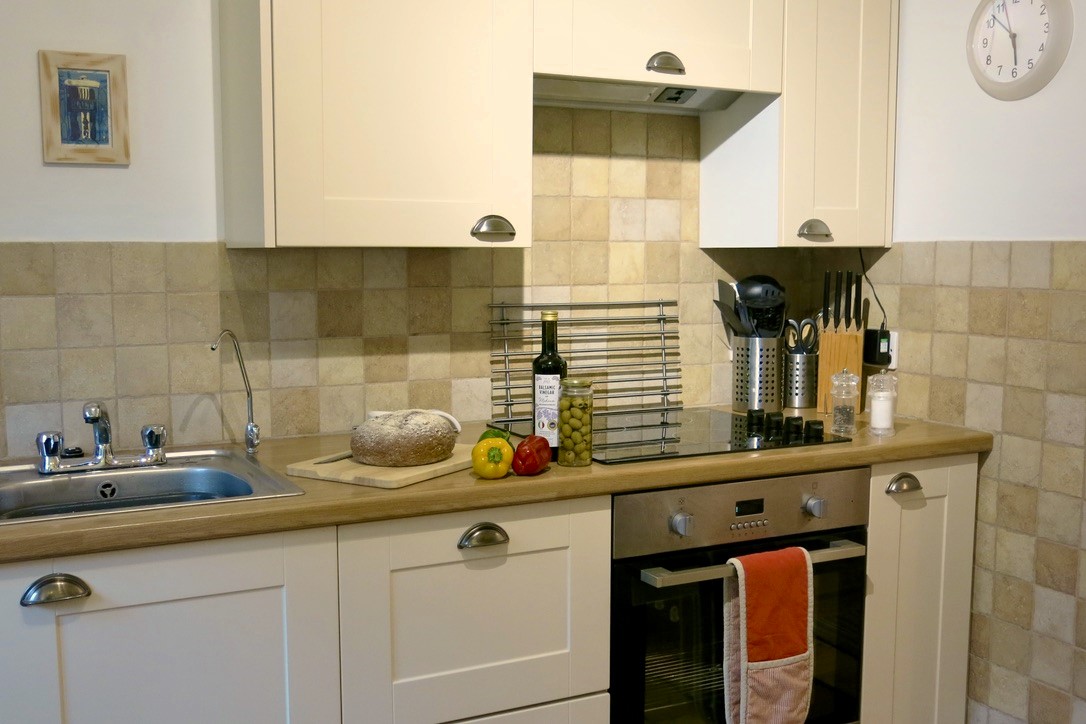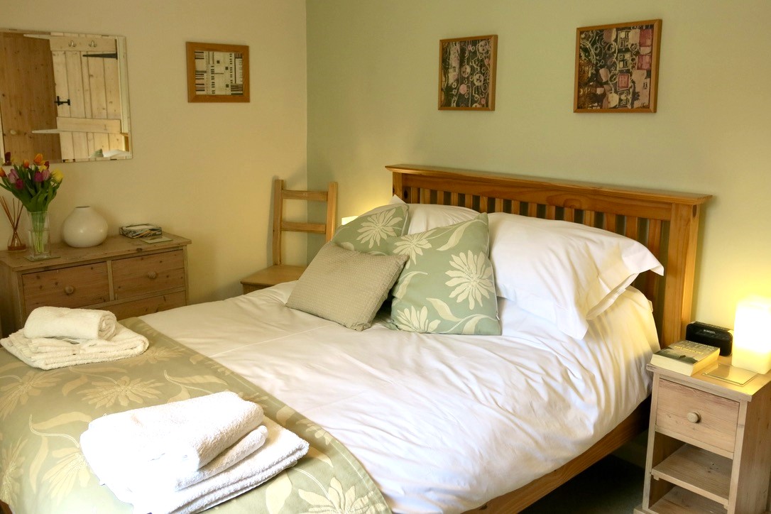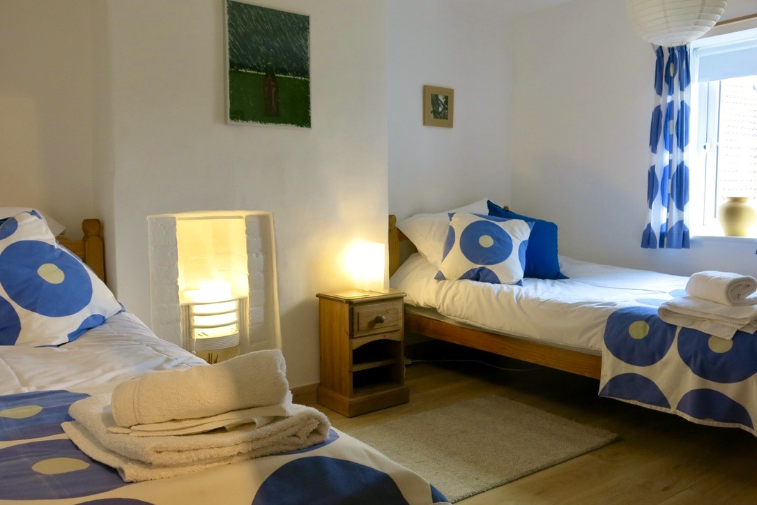 Upstairs, the master double bedroom is tastefully furnished and includes fitted cupboards, while the light and airy twin bedroom has a wooden floor, comfortable rugs and handcrafted furniture. The bathroom is bright with natural light and fitted with high-quality, modern fixtures, including an over-bath power shower.