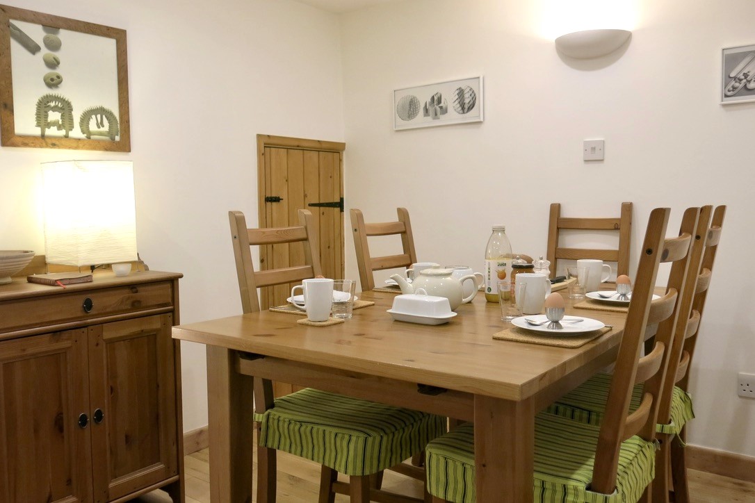Upon entering, it is clear that Jazmine Cottage has been thoughtfully renovated, retaining the character and charm of its historic origins. The ground floor includes a well-equipped fitted kitchen with a useful utility area and a separate cloakroom with WC. An open archway leads into the dining room, and double-glazed doors connect this space to the sitting room. The sitting room features a smart TV and a comfortable sofa positioned in front of a traditional-style gas fire, creating a cosy and inviting place to unwind.