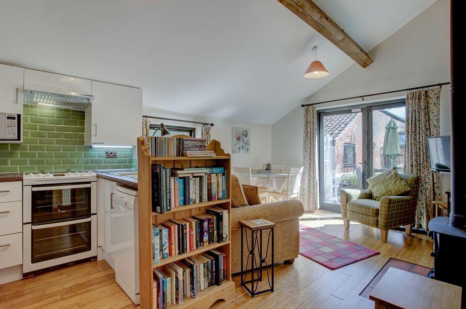 Hogs Corner is a charming single-storey barn conversion that sleeps up to four guests, making it a great choice for couples or families with young children. It offers the flexibility to connect with Harvest Keep via a lockable internal door, allowing larger groups of up to nine to stay together while still enjoying separate spaces. Inside, the cottage features a double bedroom and a bunk bedroom, a spacious family shower room with easy access, and a comfortable open-plan living area complete with a neatly designed corner kitchen, creating a welcoming space to relax and spend time together.