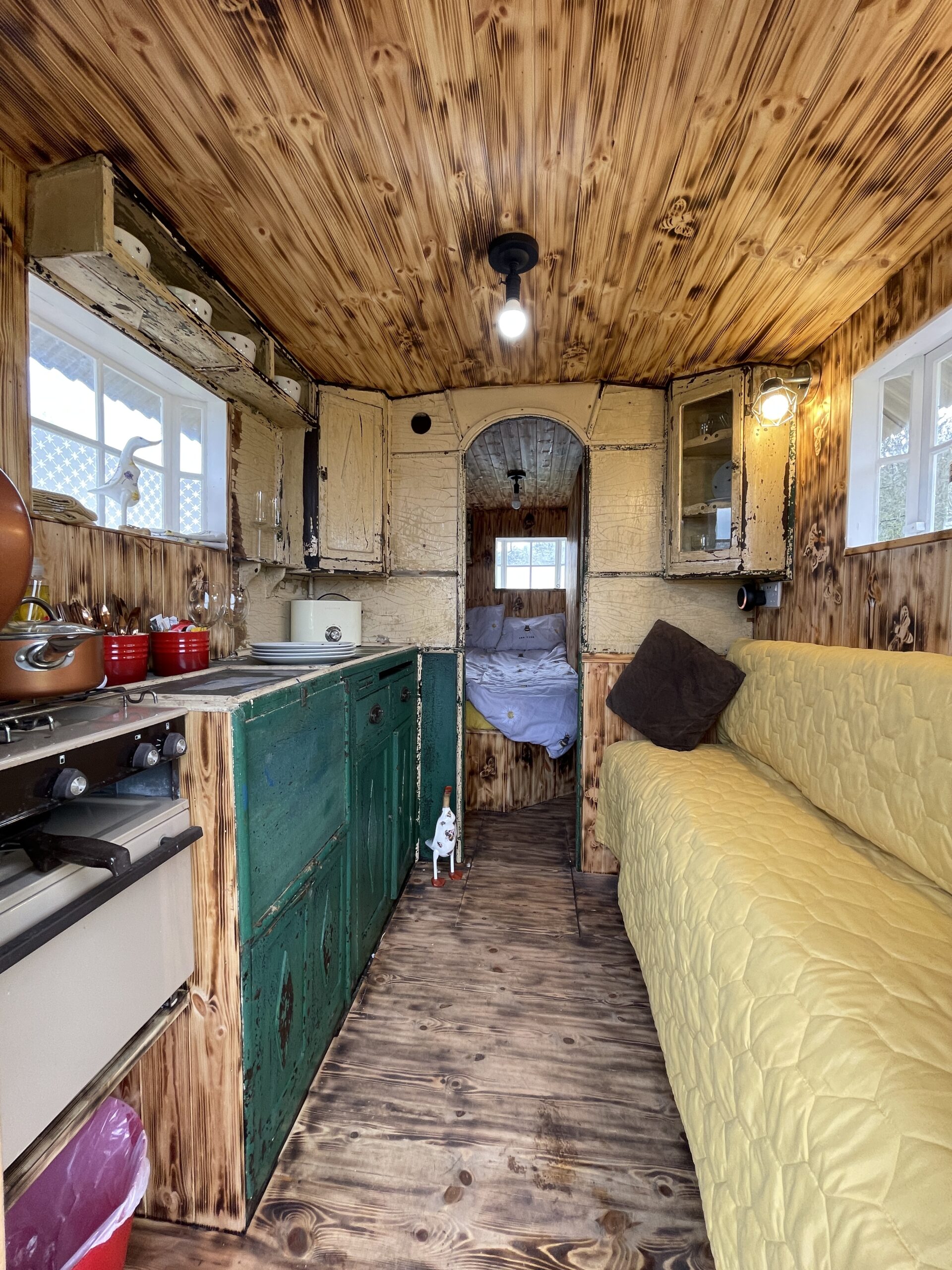 Ty Gwenyn is set in its own private area and offers a truly unique stay in an original Quaker’s carriage that has been thoughtfully modernised for comfort and enjoyment. Inside, the carriage features a double bed with a memory foam mattress, a toilet and sink, a small kitchen area with a hob and mini oven, an original Belfast sink and a cosy bench seating area, along with modern conveniences including heating, hot water, plug sockets, lighting, USB ports, a smart TV and Wi-Fi. Outside, guests can relax on the private patio with seating for two and enjoy evenings around the large fire pit, making it an ideal countryside escape.