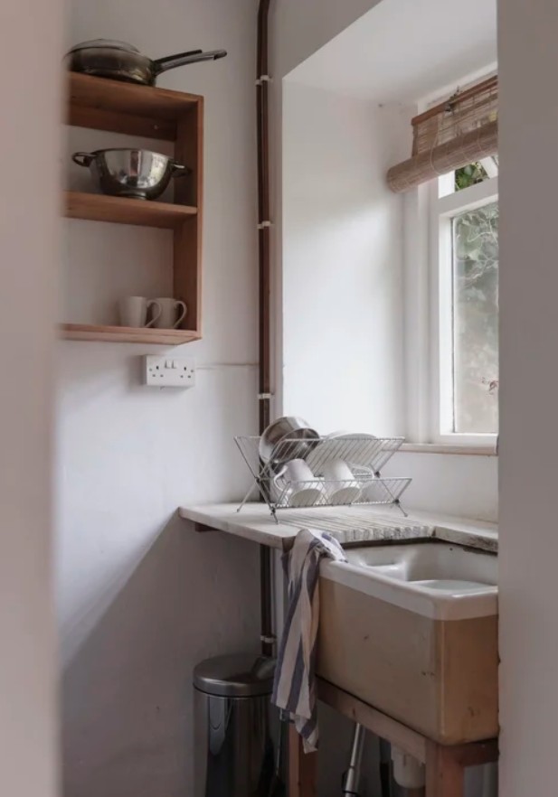 The galley kitchen is equipped with an electric cooker, washing machine and all necessary pots, pans, crockery and cutlery for up to four people. The shower room includes a shower, wash basin and toilet. The living area also features a double sofa bed, an easy chair arranged around the coal or wood-burning stove, a table and chairs for four, and a small fridge freezer, making the space both comfortable and practical for a relaxed stay.
