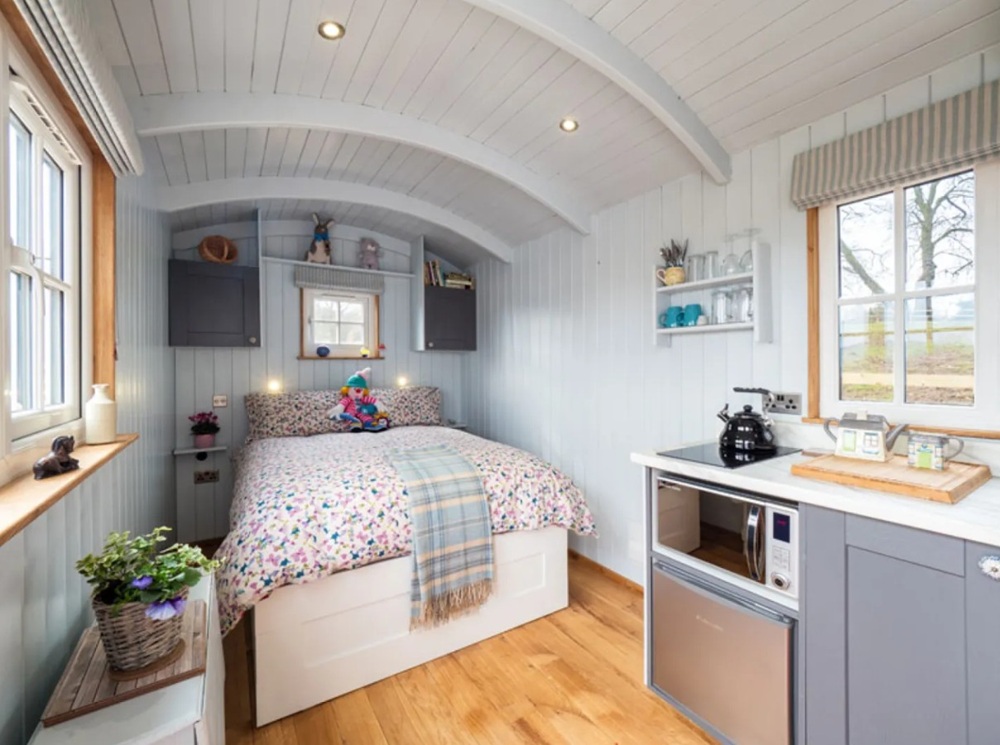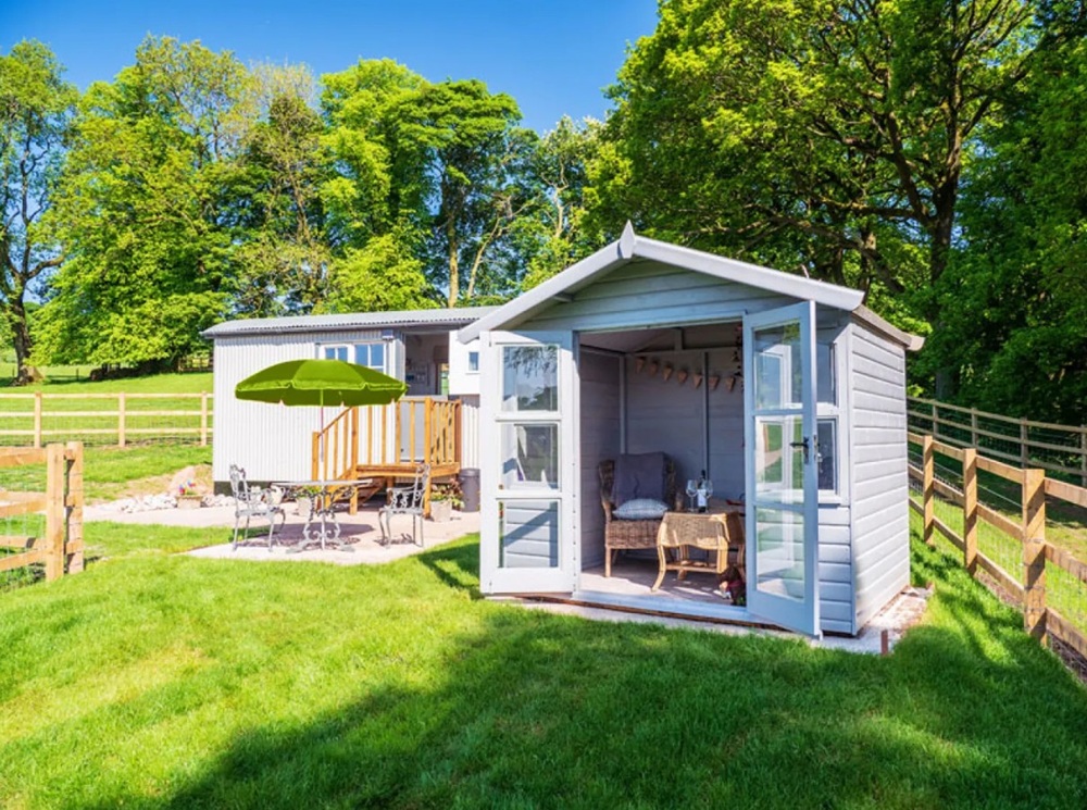 The Shepherd’s Crook sleeps two and includes a comfortable double bed, a well-equipped kitchen and an en-suite bathroom with a shower, creating a luxurious and romantic retreat. Set within its own stone circle in the picturesque village of Wincle in the Dane Valley, this shepherd’s hut offers a truly private and peaceful escape. Surrounded by nature and bordered by a bluebell woodland with a rookery, it’s a great spot for wildlife watching and enjoying far-reaching countryside views. A summerhouse provides the perfect place to relax with a glass of wine at sunset, while a BBQ and fire pit invite cosy evenings outdoors.