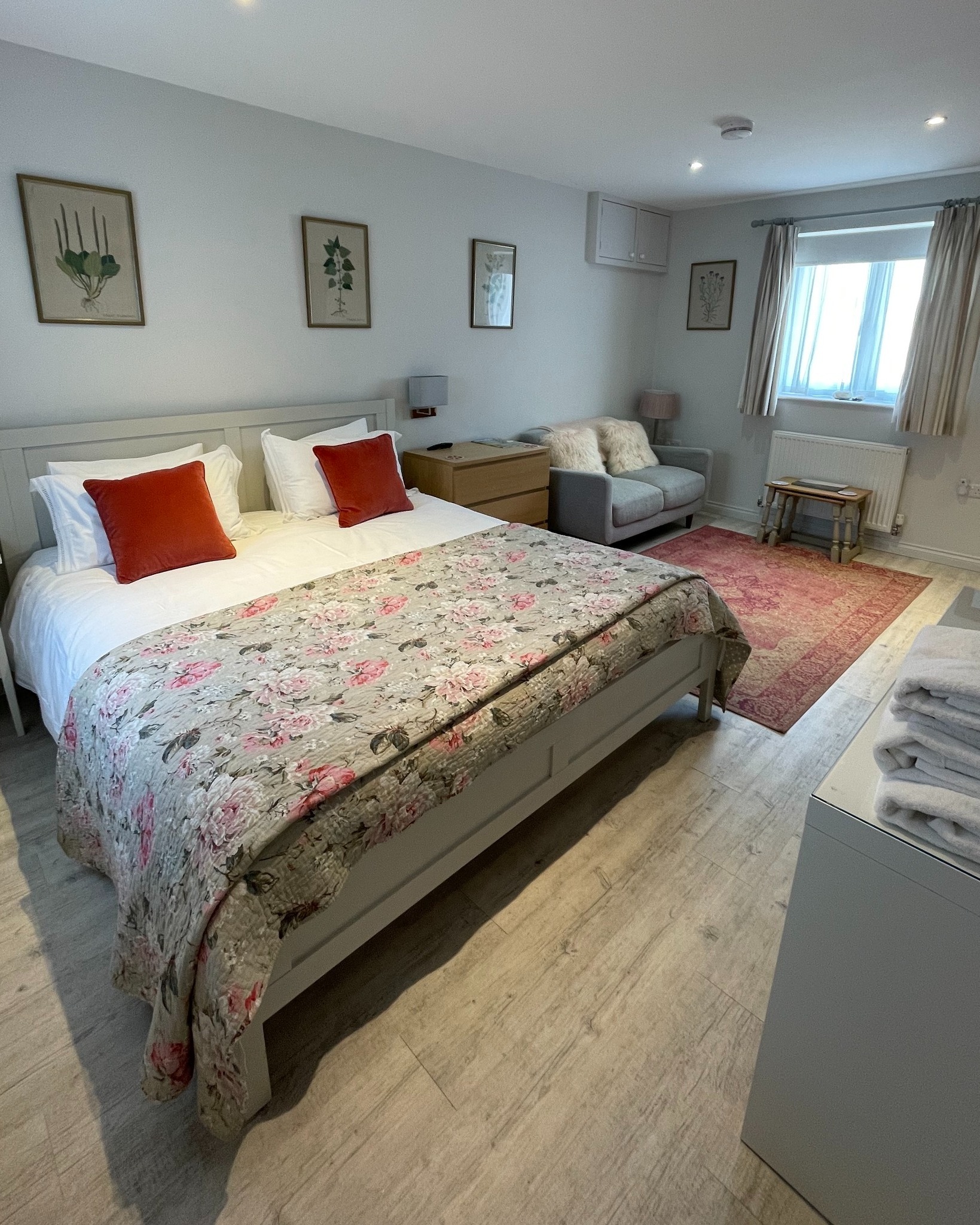 The apartment is perfect for a romantic break for two. As you enter, you’ll find a well-equipped kitchenette with a fridge, hob, toaster and kettle, along with breakfast provisions such as cereals, eggs, bread, milk and juice. The space features a comfortable seating area with a sofa and a luxurious super-king bed for a restful night’s sleep. The en-suite bathroom includes a spacious walk-in shower and a selection of complimentary toiletries for your convenience.