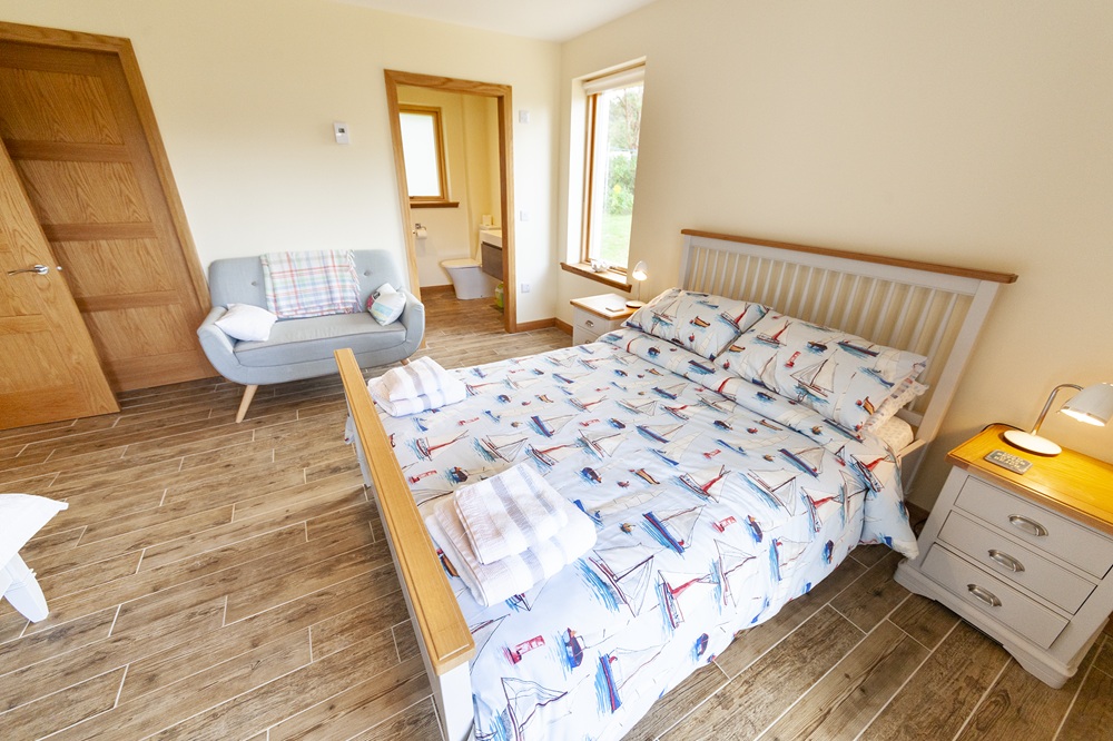 We have two attractive bedrooms, 1 king room and 1 room with a king and single. Both rooms come with en suite facilities and patio doors open onto the decking area.