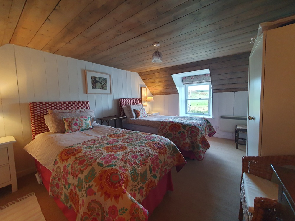 Sleeping arrangements include a ground-floor single room with a three-quarter bed and two attic bedrooms – one twin and one double – each furnished with period pieces and modern comforts such as electric blankets and hairdryers. The ground-floor family bathroom has a large walk-in shower and washing machine. Heating is provided by electric storage heaters and a wood-burning stove, with electricity included in the weekly rate. Linen and towels are supplied, though guests should bring beach towels.