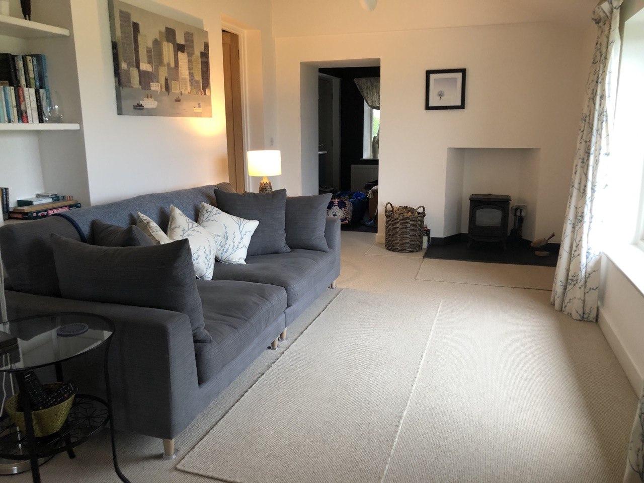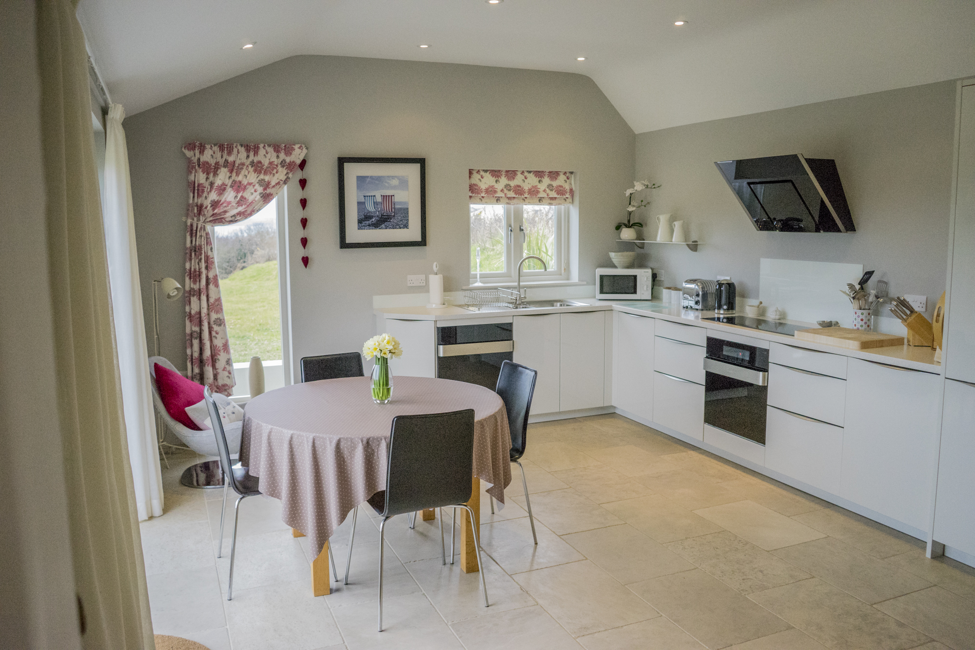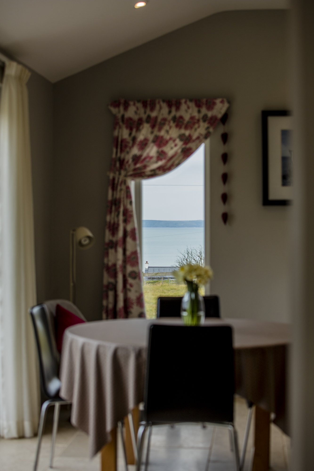 The living room enjoys views across the fields and benefits from the evening sun, making it an inviting place to relax. During the winter months, the wood burner creates a warm and cosy atmosphere, perfect for quiet evenings indoors. The renovated kitchen diner is spacious, light and fitted with modern stone-coloured high-gloss units and sleek black glass appliances. Underfloor heating warms the tumbled marble flooring, making the room welcoming in all seasons. Large patio doors open onto the garden, where guests can enjoy meals in the sunshine while taking in the peaceful rural and coastal views. The bedroom provides a calm space to unwind, furnished with a king-size bed, soft furnishings and Egyptian cotton linen.