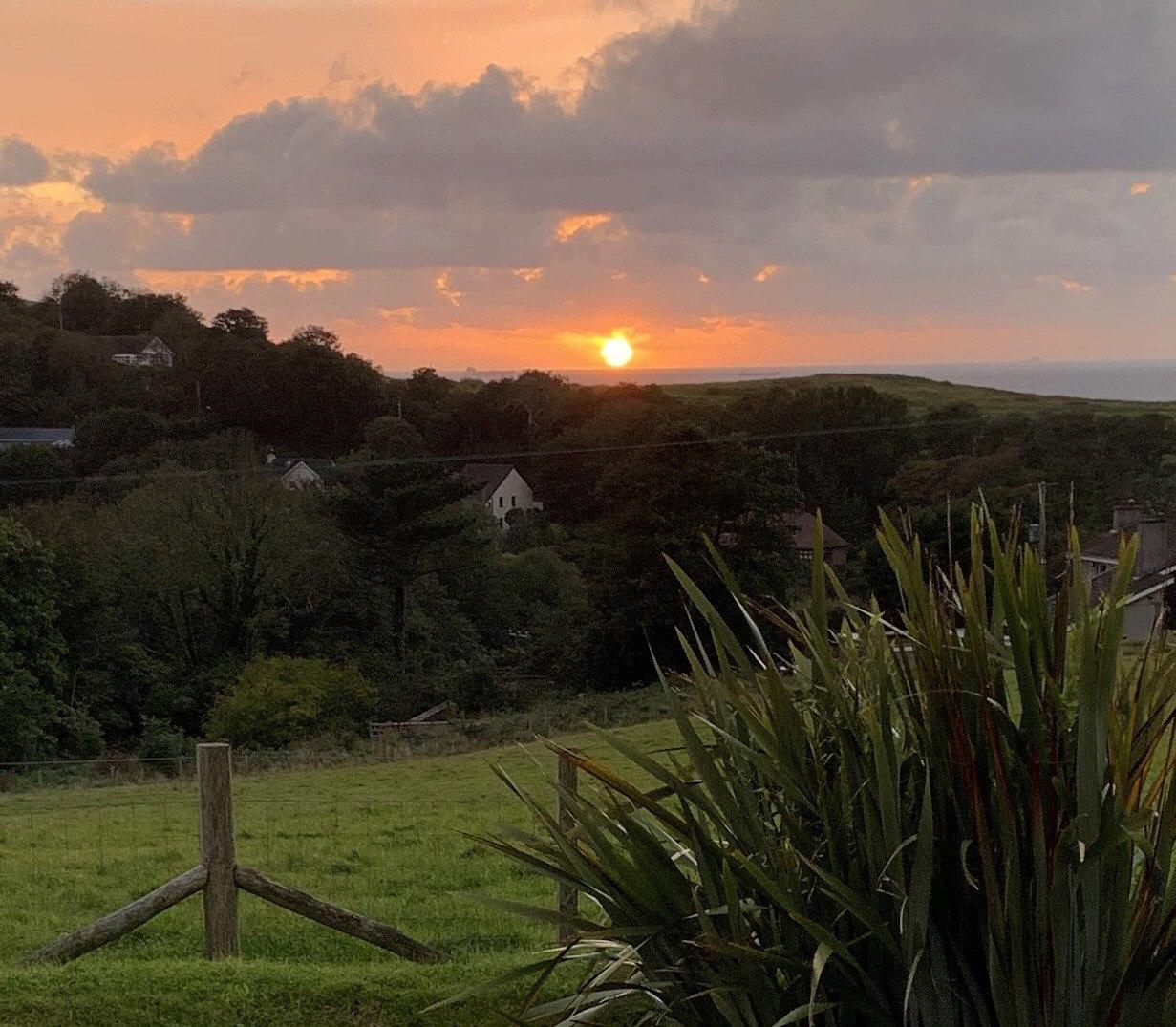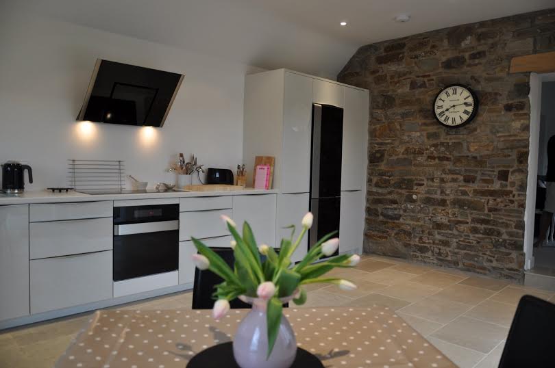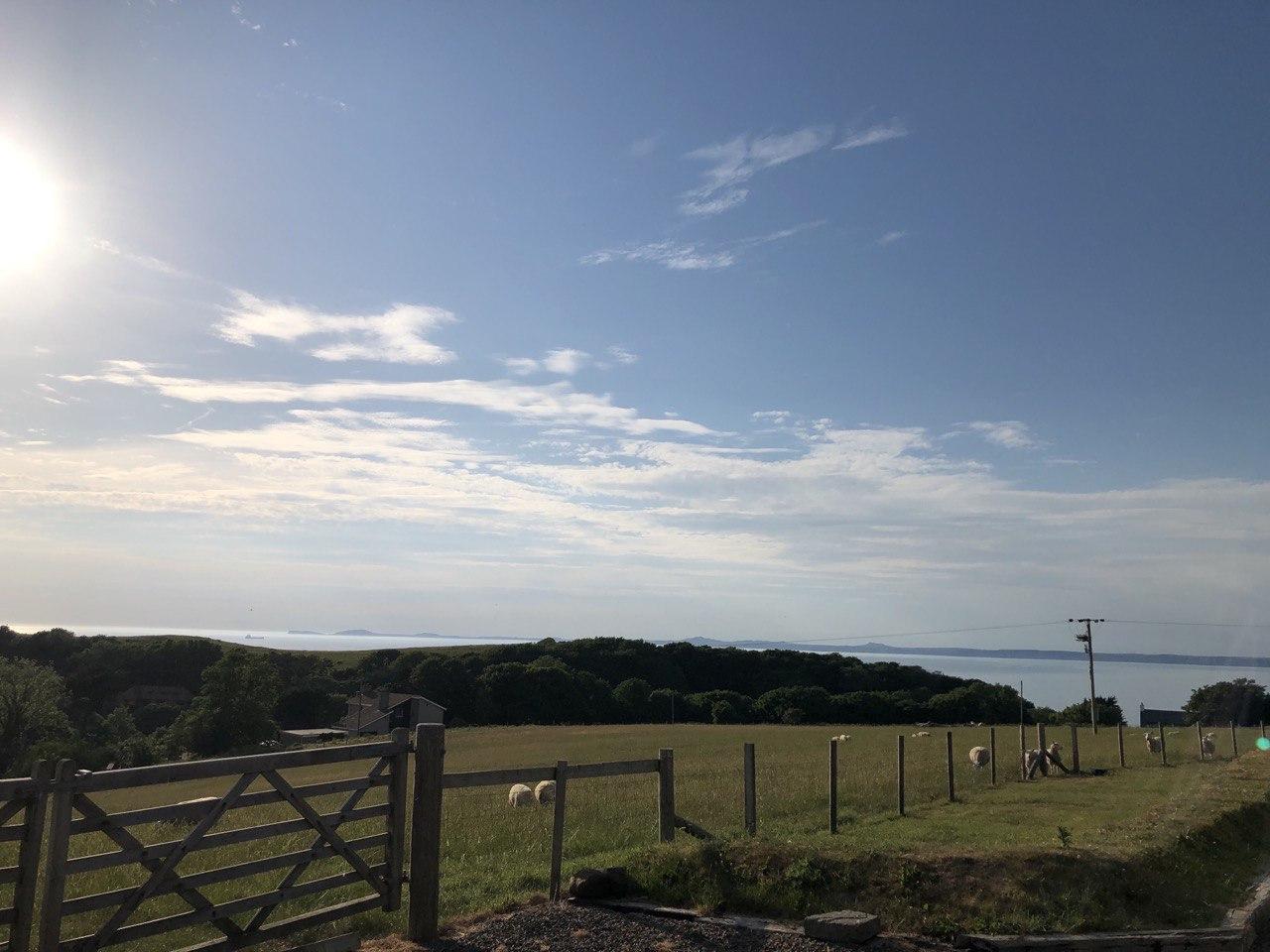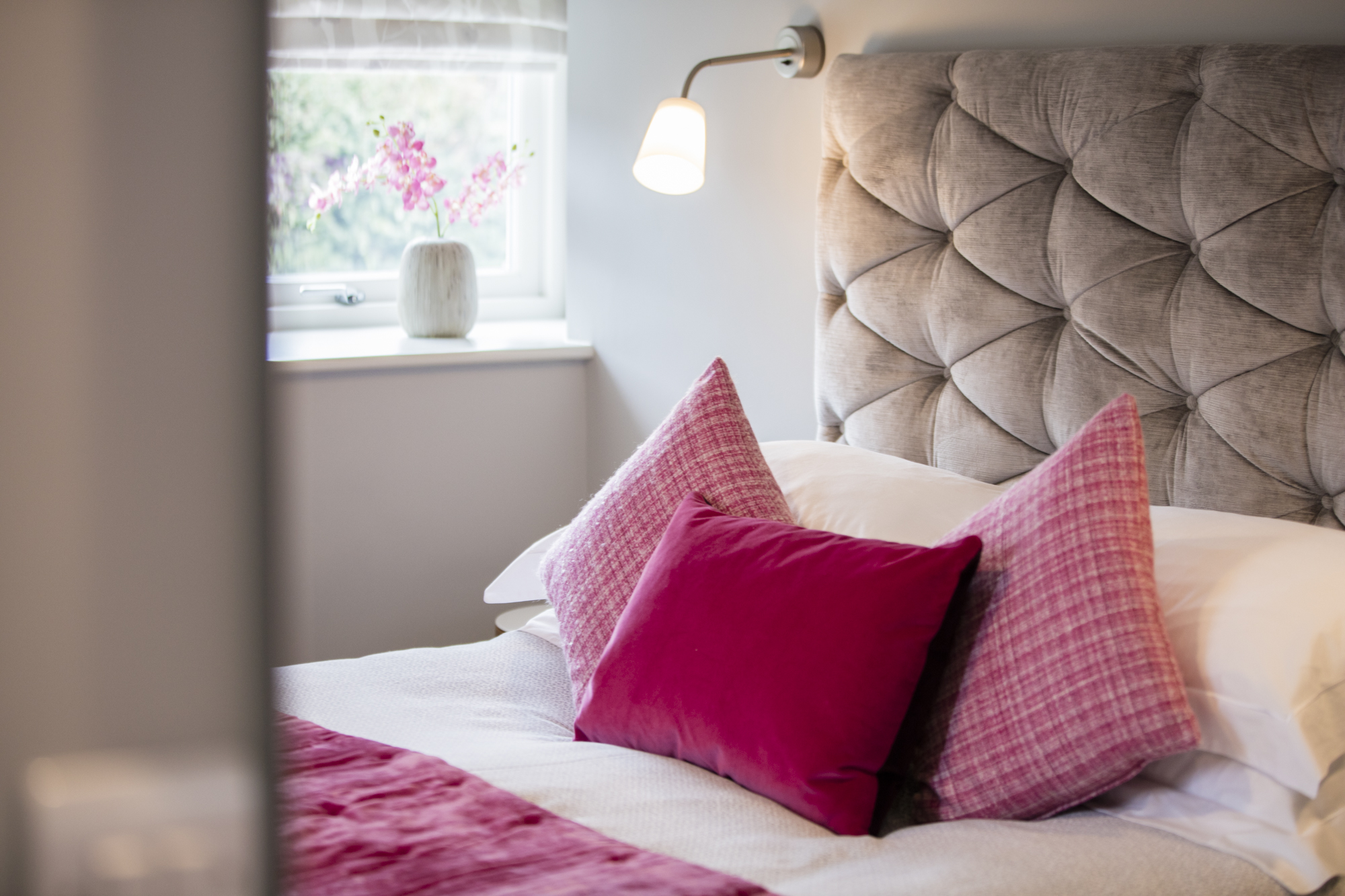 The living room enjoys views across the fields and benefits from the evening sun, making it an inviting place to relax. During the winter months, the wood burner creates a warm and cosy atmosphere, perfect for quiet evenings indoors. The renovated kitchen diner is spacious, light and fitted with modern stone-coloured high-gloss units and sleek black glass appliances. Underfloor heating warms the tumbled marble flooring, making the room welcoming in all seasons. Large patio doors open onto the garden, where guests can enjoy meals in the sunshine while taking in the peaceful rural and coastal views. The bedroom provides a calm space to unwind, furnished with a king-size bed, soft furnishings and Egyptian cotton linen.