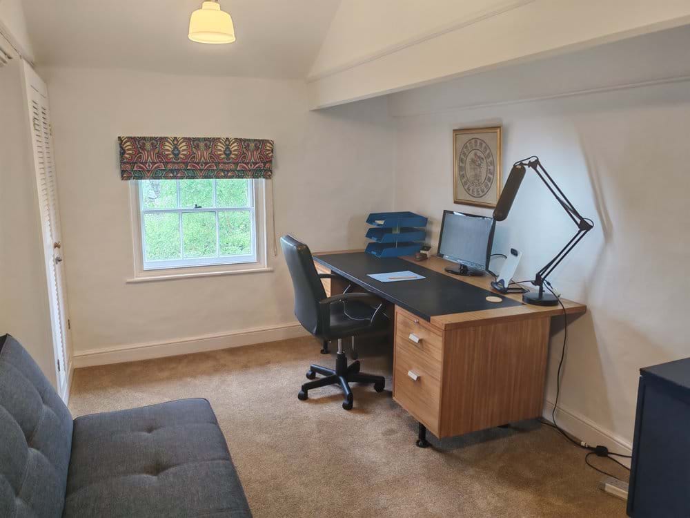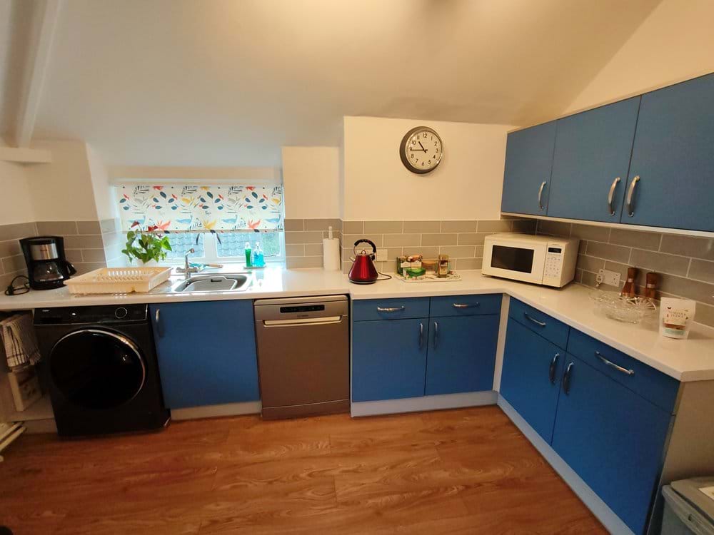 The apartment includes three bedrooms: two spacious doubles and a charming single room, believed to be the oldest bedroom in the house. True to its name, the space is filled with natural light thanks to five skylights, particularly noticeable in the large dining and living area. The fully equipped kitchen features an oven, hob, fridge-freezer, microwave, toaster, coffee maker and dishwasher, with plenty of room for guests to chat while meals are prepared. A washer-dryer is also provided for convenience. A separate study offers a quiet space for catching up on work or attending online meetings.