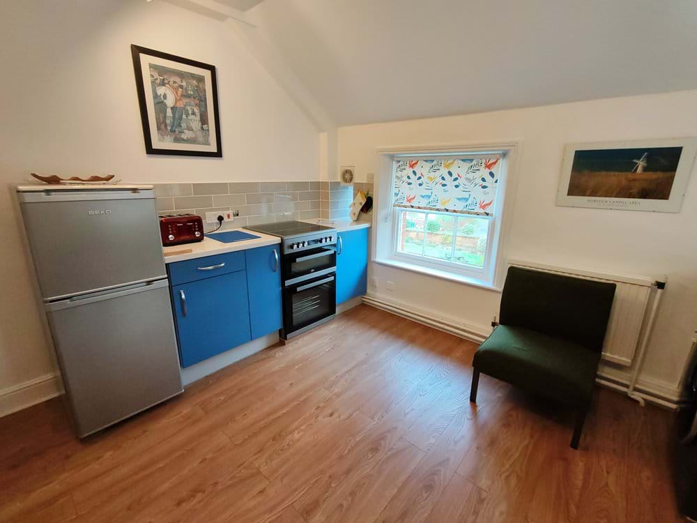 The Skylight Apartment is a self-contained holiday home for eight guests, set within a large listed building in the village of Loddon. The location provides easy access to the Norfolk Broads, the nearby coastline and the historic city of Norwich, making it an ideal base for exploring the region. Occupying the entire top floor of the Georgian section of the building, the apartment retains many original features, including low beams and doorways that add character but require taller guests to take care.