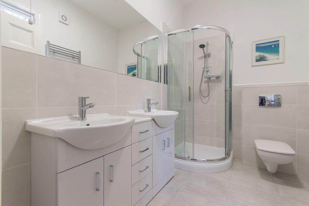 Climbing the original balustraded staircase brings you to the first floor, which features four bright, south-facing bedrooms and a family bathroom. Bedroom one has a king-size bed and an en-suite shower room, while bedrooms two and three each have a double bed and space for a cot if needed. Bedroom four is also furnished with a king-size bed. A large bathroom with a shower and double vanity unit serves this floor. All rooms are decorated in calm, elegant tones with furnishings that complement the home’s period character.