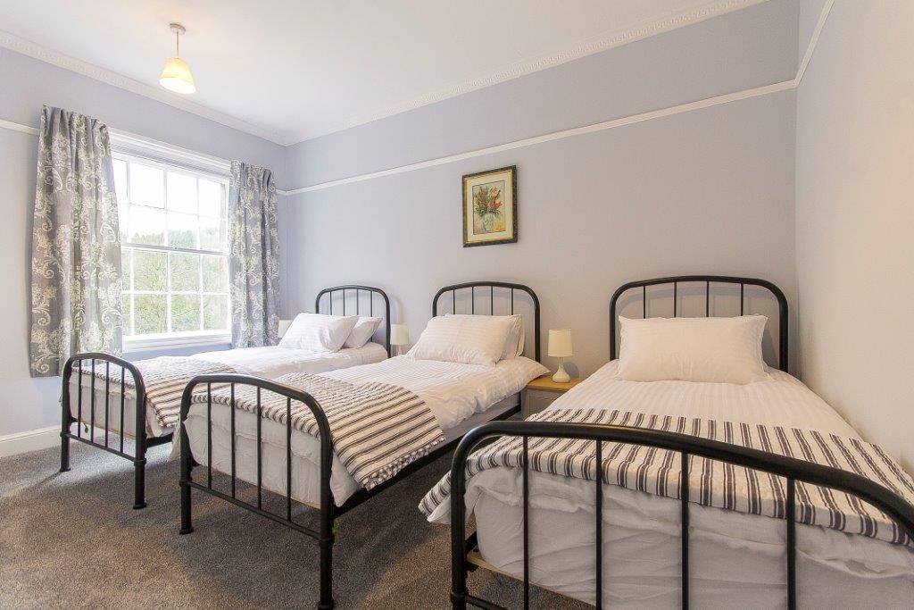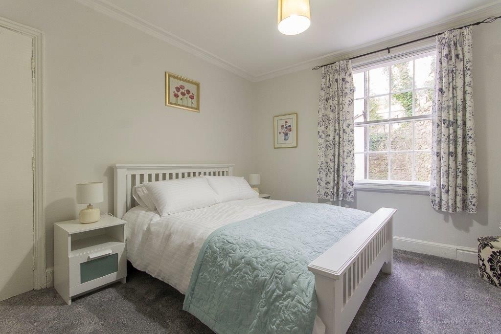 The entrance to 98 Fountain Villas opens into a beautiful hallway with high ceilings and original period features. To the left is the dining room, which overlooks the promenade and river and offers enough space for sixteen guests to dine together in comfort. After a shared meal, guests can move across the hall to the spacious lounge, which has comfortable seating for everyone and a wall-mounted smart TV, as well as a selection of books and games for all ages.