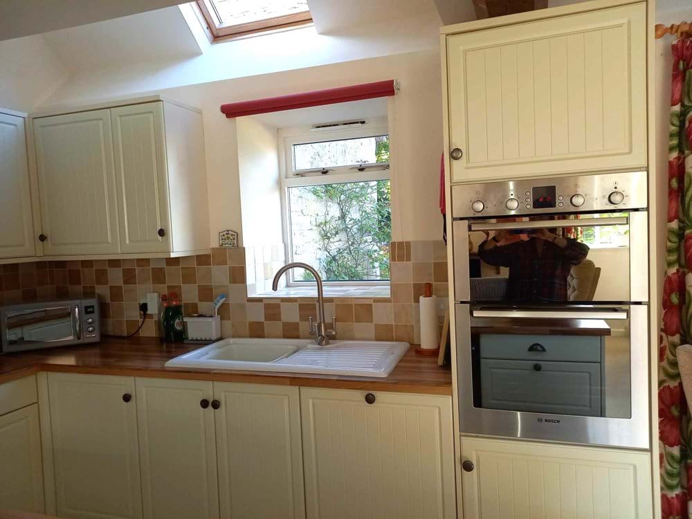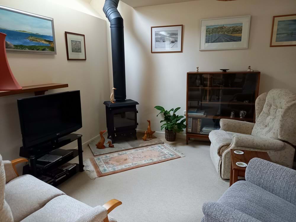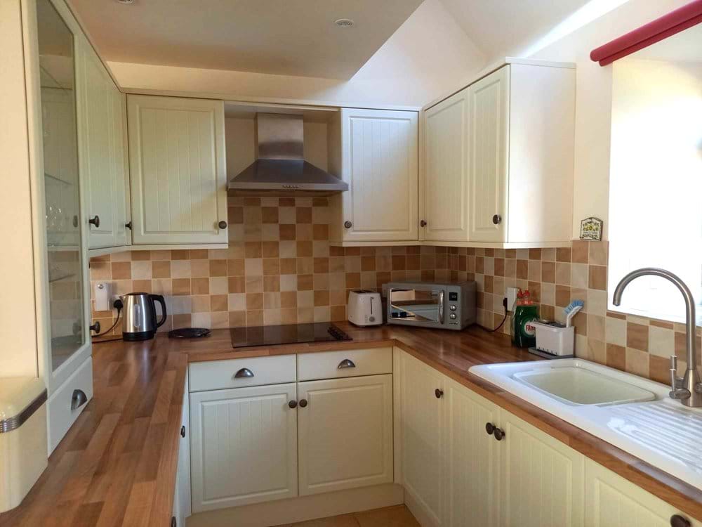 An internal door leads through to the open-plan living, dining and kitchen area, which is tastefully decorated and thoughtfully arranged for a comfortable stay. The kitchen is fully equipped with a double electric oven, microwave, two fridges, dishwasher, four-ring electric hob, kettle and toaster, along with a well-planned workspace. Please note that while a wood-burning stove is installed, it is not currently in use.