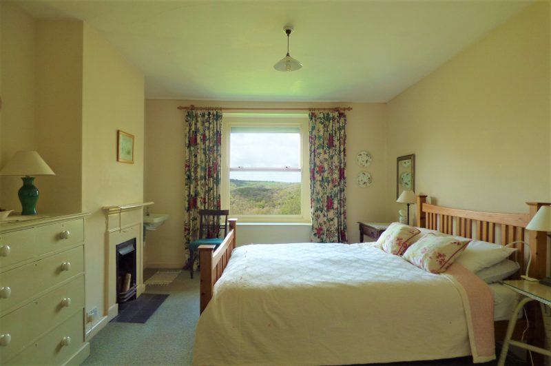 The accommodation sleeps four guests plus a cot-sized child if required. There is a generous double bedroom with a king-size bed and ample space for a cot, along with a second bedroom featuring two full-size single beds. The large bathroom includes a bath with shower, wash basin and WC, with an additional basin in the main bedroom and a further WC and basin located downstairs.