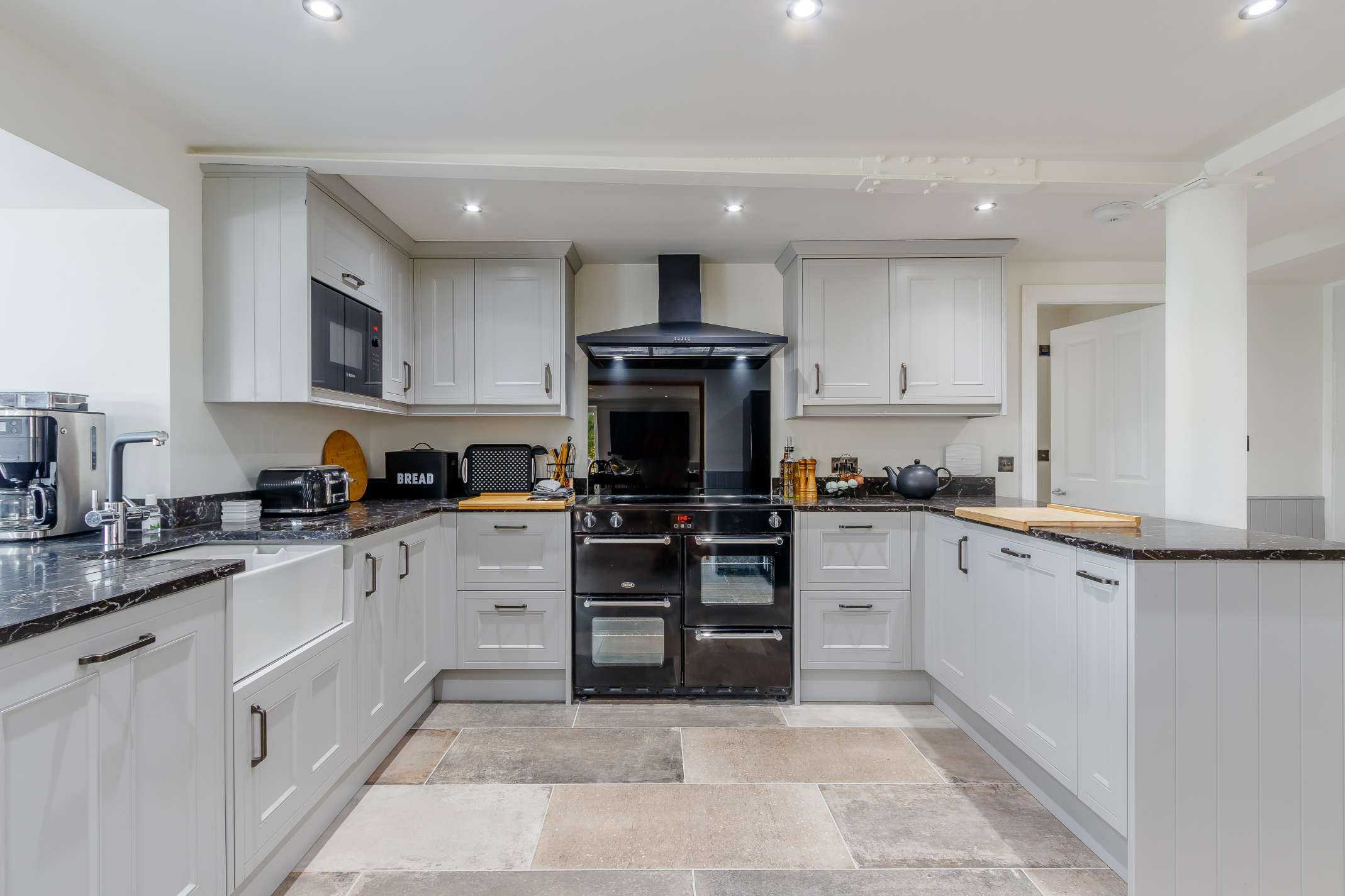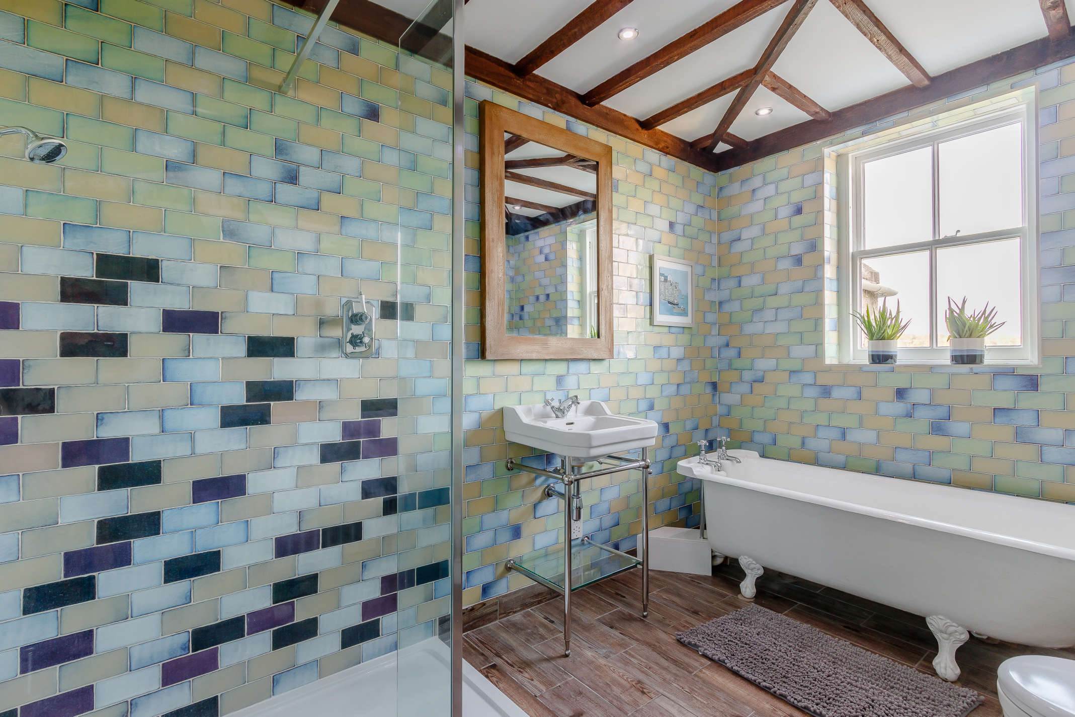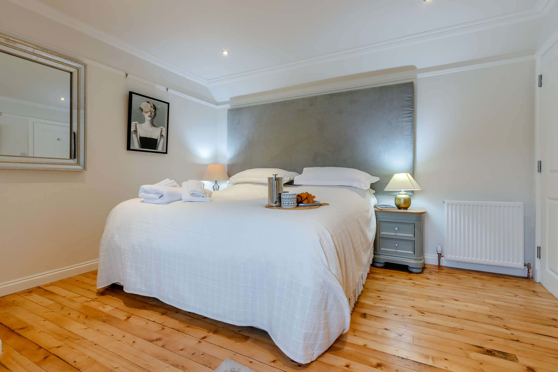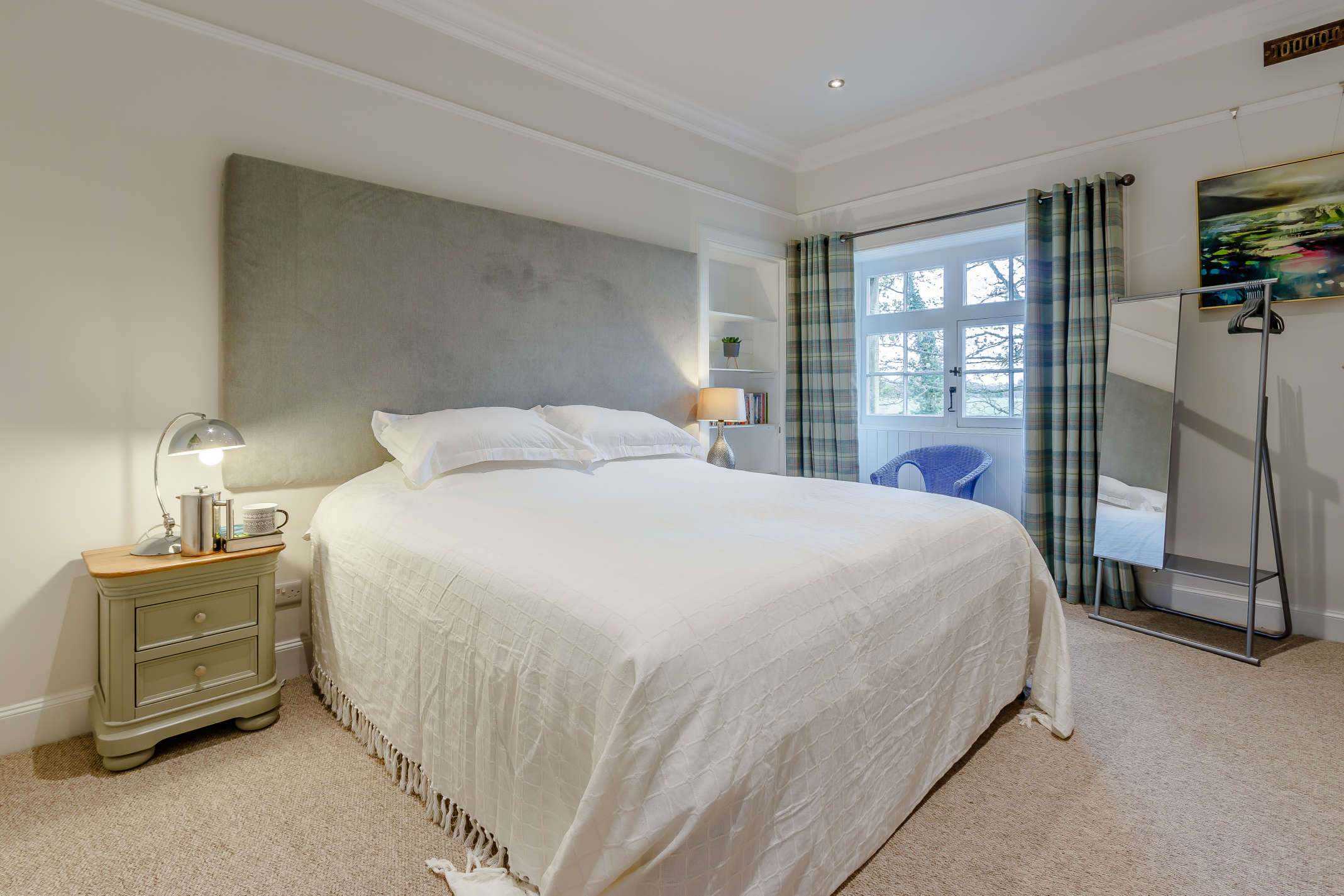 Upstairs, there are five beautifully designed bedrooms, each fitted with zip-and-link super king-size beds that can be arranged as twin singles to accommodate up to ten guests comfortably. All bedrooms offer generous storage and lovely views across either the garden or the surrounding countryside. One bedroom benefits from a well-appointed en-suite, while the main bathroom features a vintage roll-top bath, bringing the total to four toilets and three showers throughout the house.
