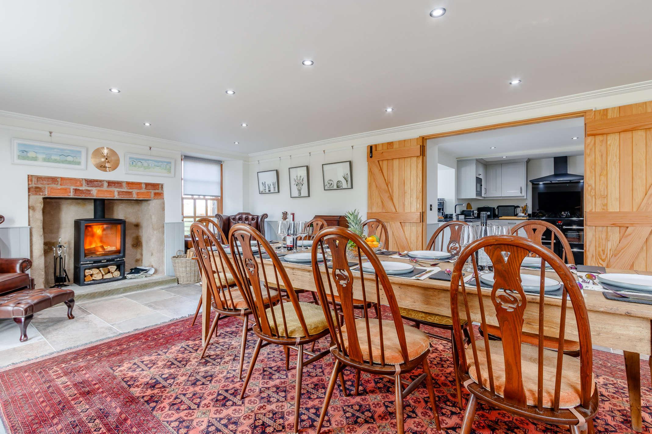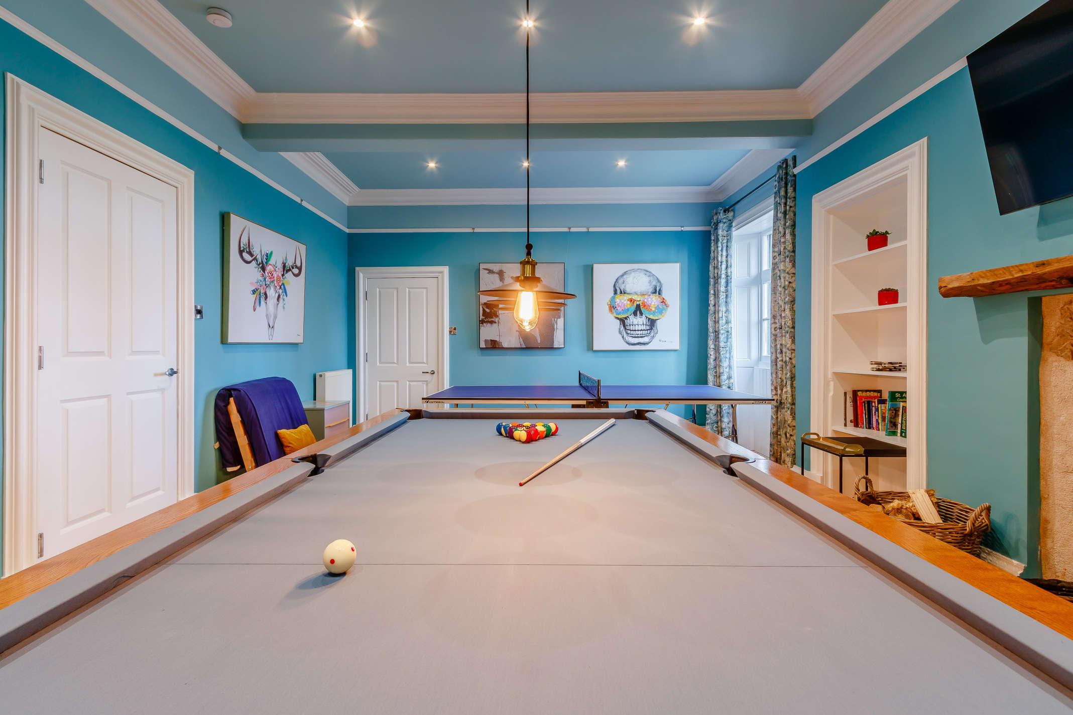 On entering the house, guests are welcomed into a spacious porch, ideal for storing wet or muddy outdoor clothing. Off the main downstairs landing is a warm and inviting lounge with a comfortable sofa, wood-burning stove and smart television. Opposite, a well-equipped games room features a full-size American pool table, full-size table tennis table, another smart television and a second wood burner. To the rear of the house is a large open-plan space combining two dining areas and a fully equipped kitchen designed for family dining. The kitchen includes an electric range oven and hob, American-style fridge freezer with water and ice dispenser, microwave, dishwasher, washing machine, tumble dryer and instant hot water tap. The two dining rooms seat up to 16 people and are complemented by a further wood-burning stove and smart television. This central living area opens directly onto the outdoor seating area and hot tub, while a conveniently located wet room with shower and two toilets completes the ground floor.