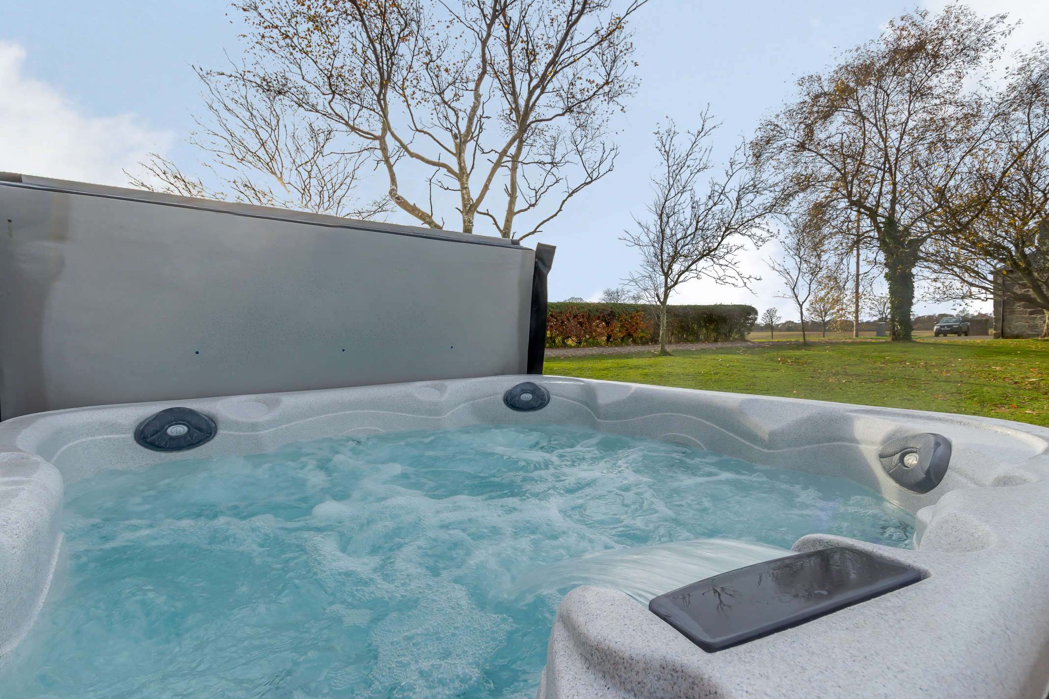 Outside, guests can enjoy a well-maintained walled garden with cobbled seating and a barbecue area beside a sunken six-person hot tub. The grounds also provide parking for up to six vehicles, ensuring plenty of space for larger groups.