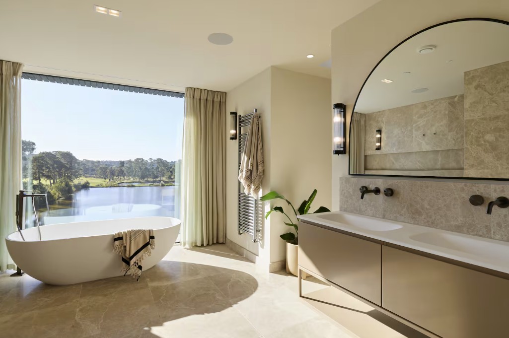 The master bedroom features a dramatic fixed glass window with uninterrupted views down the lake, along with a large private terrace. Three further bedrooms have balconies overlooking the lake and golf course, while another bedroom benefits from a corner window seat with floor-to-ceiling glazing and views of the garden and water beyond.