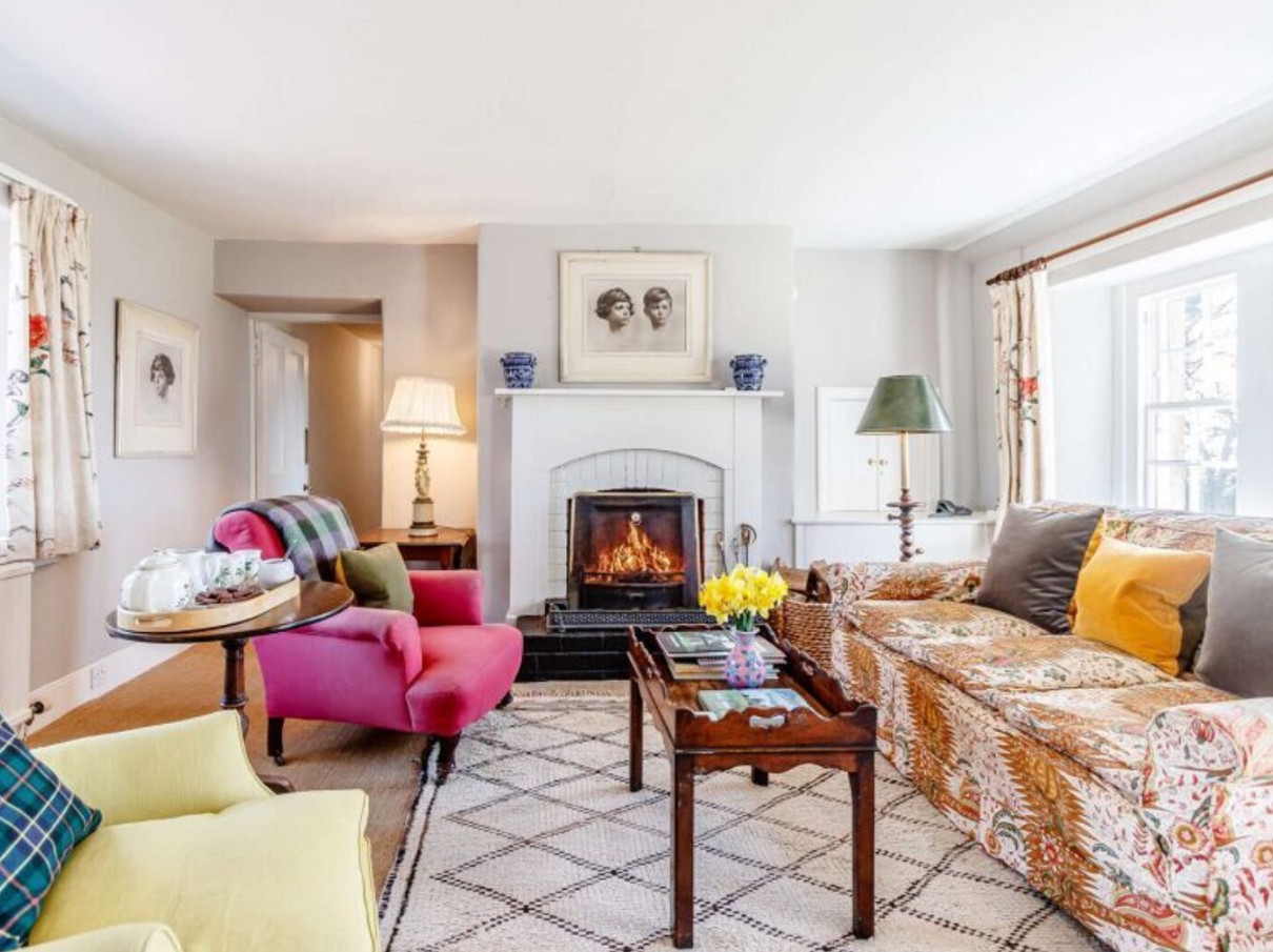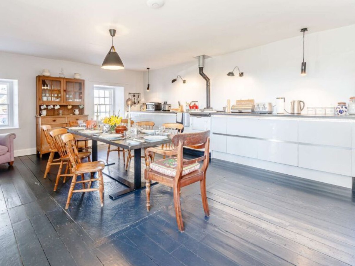 The lounge is an inviting retreat, perfect for unwinding in front of the fire with a book chosen from the cottage’s shelves. The kitchen is both practical and full of charm, combining sleek worktops and distinctive lighting with a dark wood floor, an Aga-style oven, an antique dresser and an eclectic mix of chairs that make it a relaxed spot for morning coffee or casual conversation. For evenings, the dining room offers a cosy and refined setting.