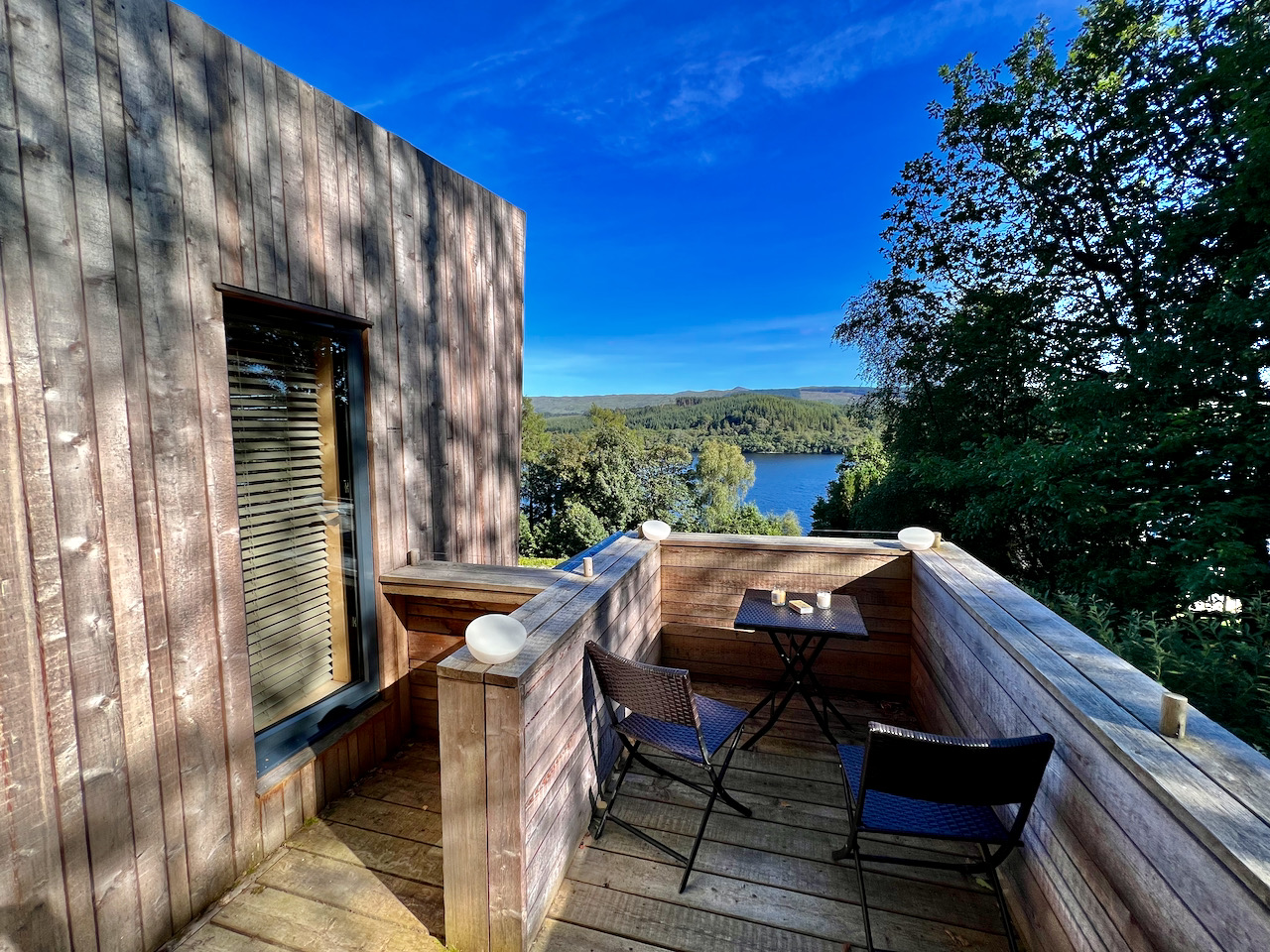 Each split-level interior is entered from a private deck, with steps leading down beneath a gently rising ceiling from the living area to the bedroom. Tall windows offer stunning views of Loch Awe and fill the space with natural daylight.