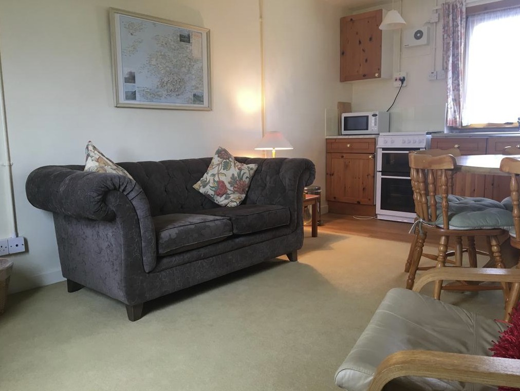 Nevis Cottage accommodates up to four guests, featuring a generous double bedroom with a standard double bed and an additional double sofa bed suitable for occasional use in the spacious open-plan living area. The cottage includes a combined lounge, dining and kitchen space equipped with a TV and music system, along with a walk-in shower, gas central heating and complimentary Wi-Fi. The kitchen comes fully stocked with all the essentials needed for a comfortable, self-catering stay and a cot and high chair are available on request at no extra cost, subject to availability.