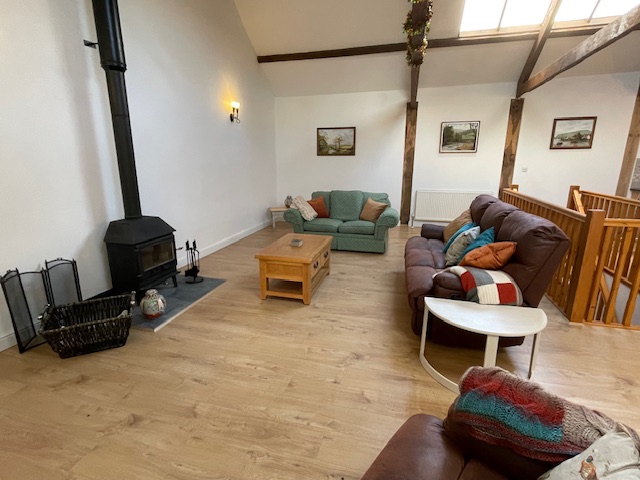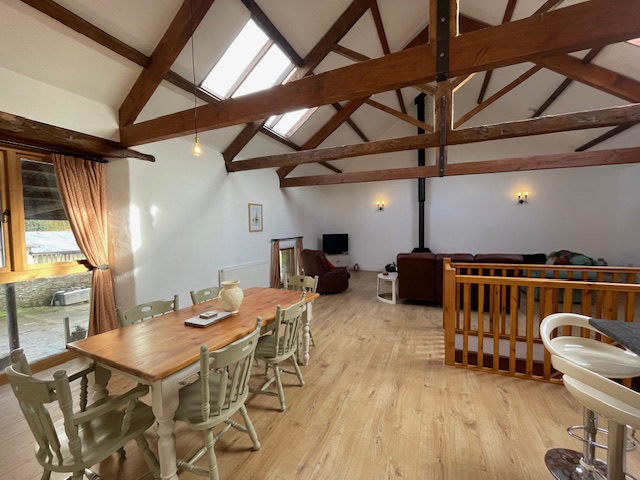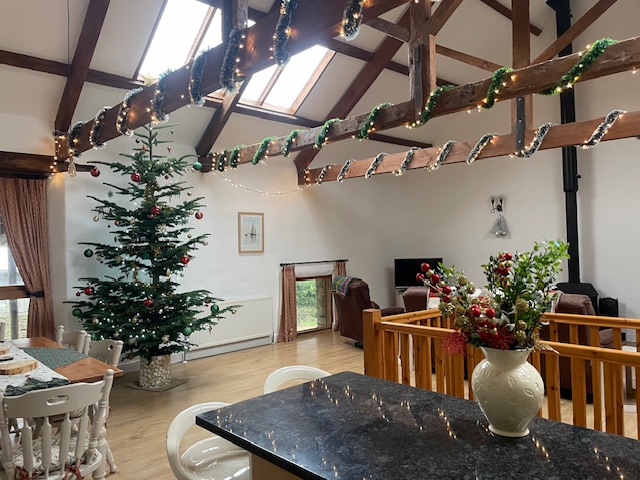The self-catering cottages are arranged in a courtyard of converted barns alongside the farmhouse. Each cottage sleeps six guests across three ground-floor bedrooms, including one king-size en-suite, one king-size room and one twin room sharing a family bathroom. Upstairs, the open-plan living area features original roof trusses and a vaulted ceiling, creating a bright and airy space for relaxing. The cottages work well for two families holidaying together or a larger group of friends and both are decorated for Christmas with a large tree during the festive season.