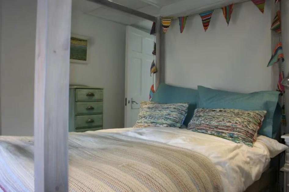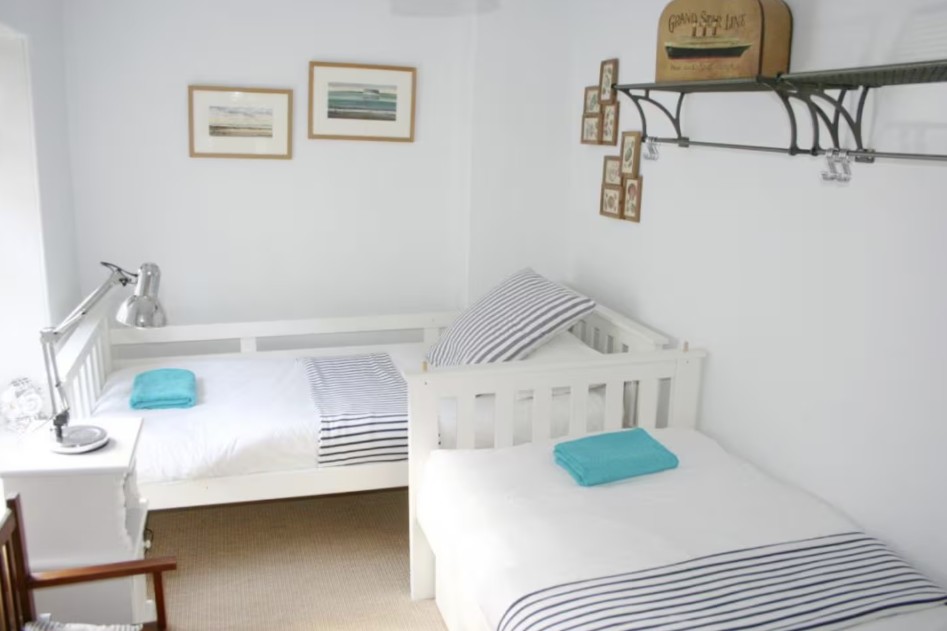 The master bedroom has a four-poster double bed and built-in wardrobe storage. Just off this room, the bathroom features a large Fired Earth bath and a heated towel rail. The second bedroom offers two full-size single beds, along with under-bed storage, drawers and shelving.